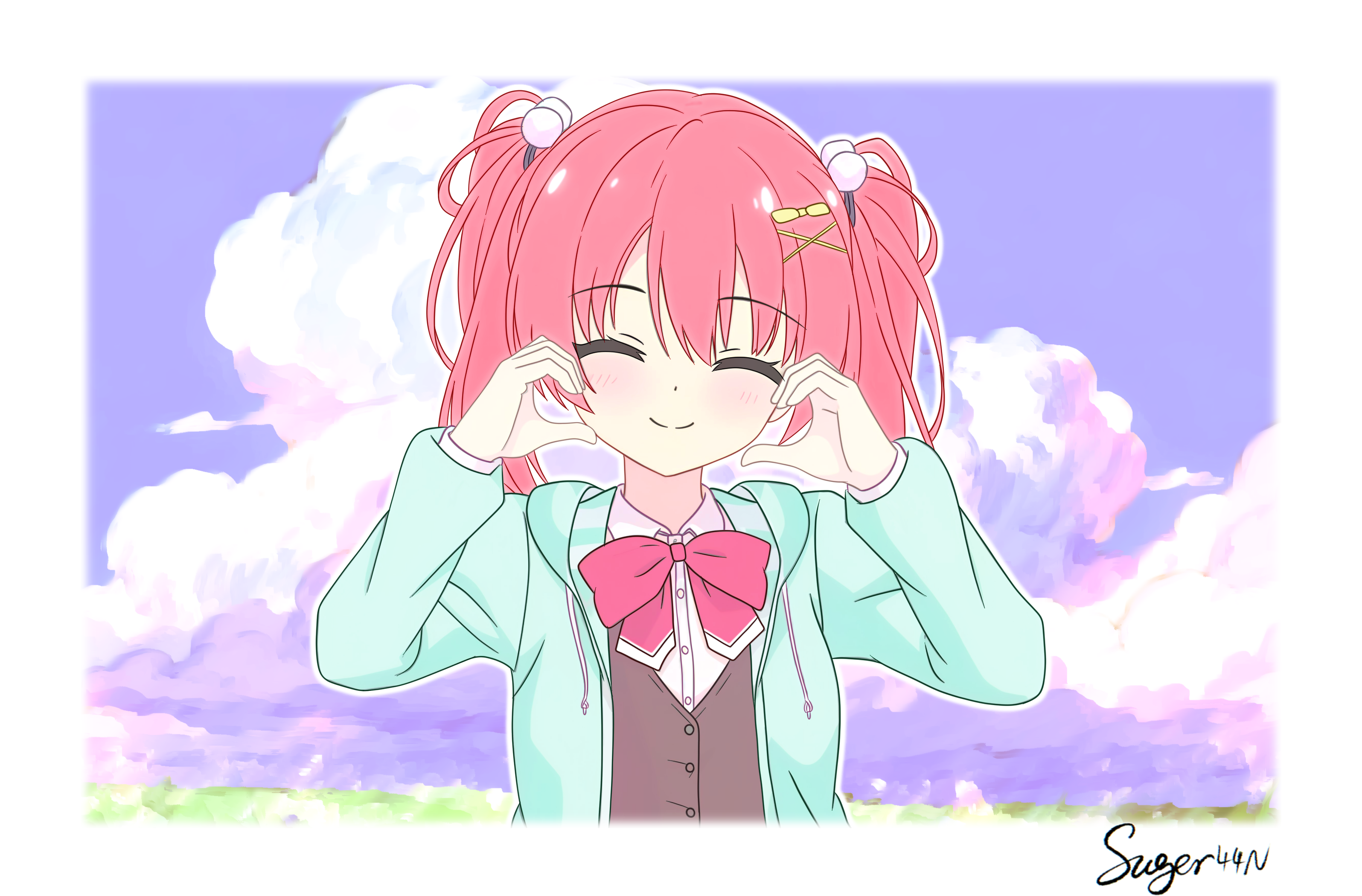 1boy1girlaqua hoodieblushborderbowbowtiebrown vestclosed eyesclosed mouthcloudcollared shirtcumulonimbus clouddayfacing viewerhair between eyeshair bowhair ornamenthands uphappyheartheart handshoodhood downhoodiekikka academy school uniformlong sleevesmedium hairopen clothesopen hoodieoutdoorsoutlinepom pom (clothes)pom pom hair ornamentpurple skirtred bowred bowtiered hairschool uniformshirtsignatureskirtsmilesolosplit mouthsuger44ntwintailsupper bodyvestwhite borderwhite outlinewhite shirtx hair ornamentyellow bow