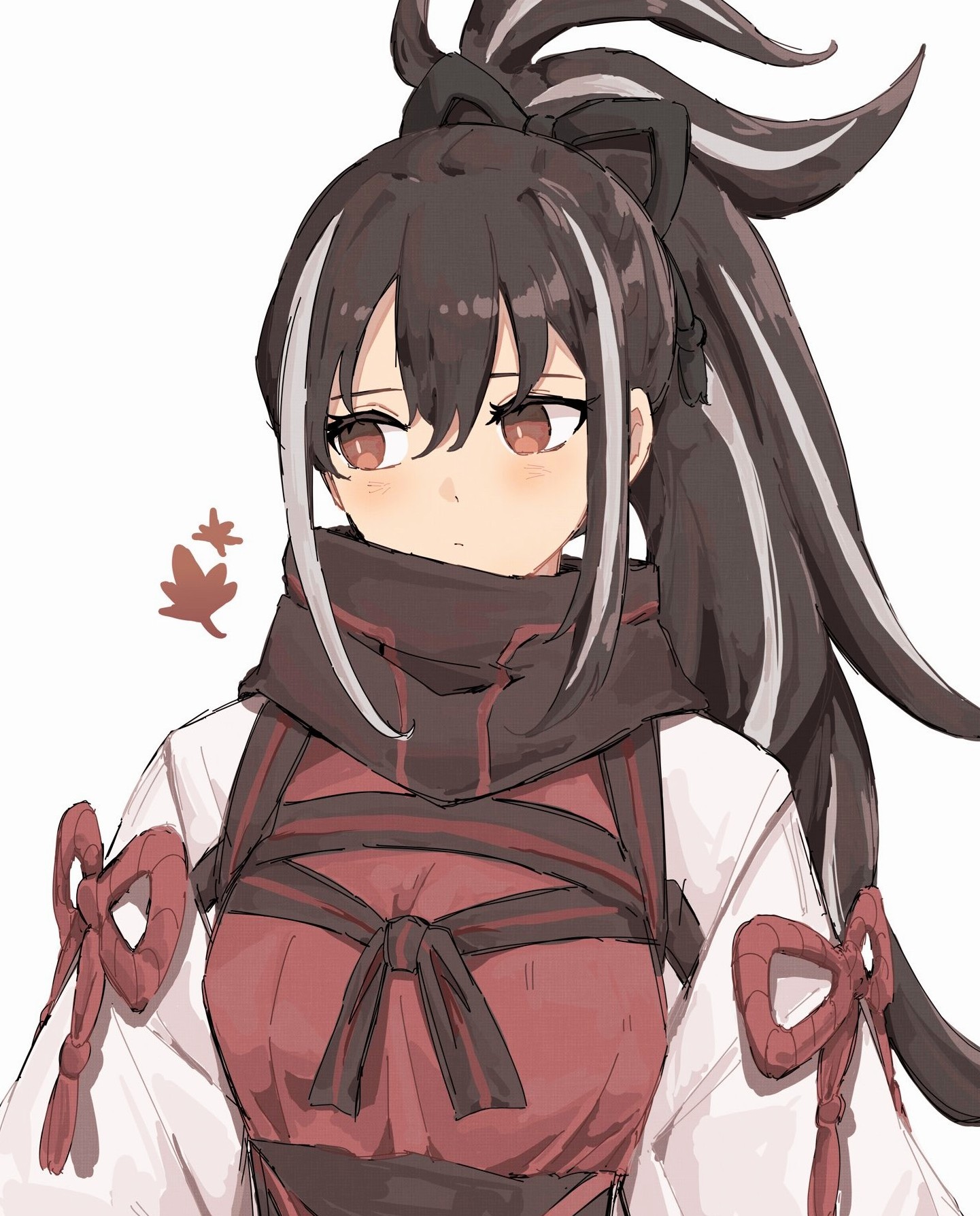 1girlblack hairblack scarfblushbreastsbrown eyescropped shirtkawakami gensai (first ascension) (fate)long hairlong sleeveslooking to the sidemedium breastsmulticolored hairponytailred shirtscarfshirtsidelockssolostreaked hairwhite hairwhite sleeves