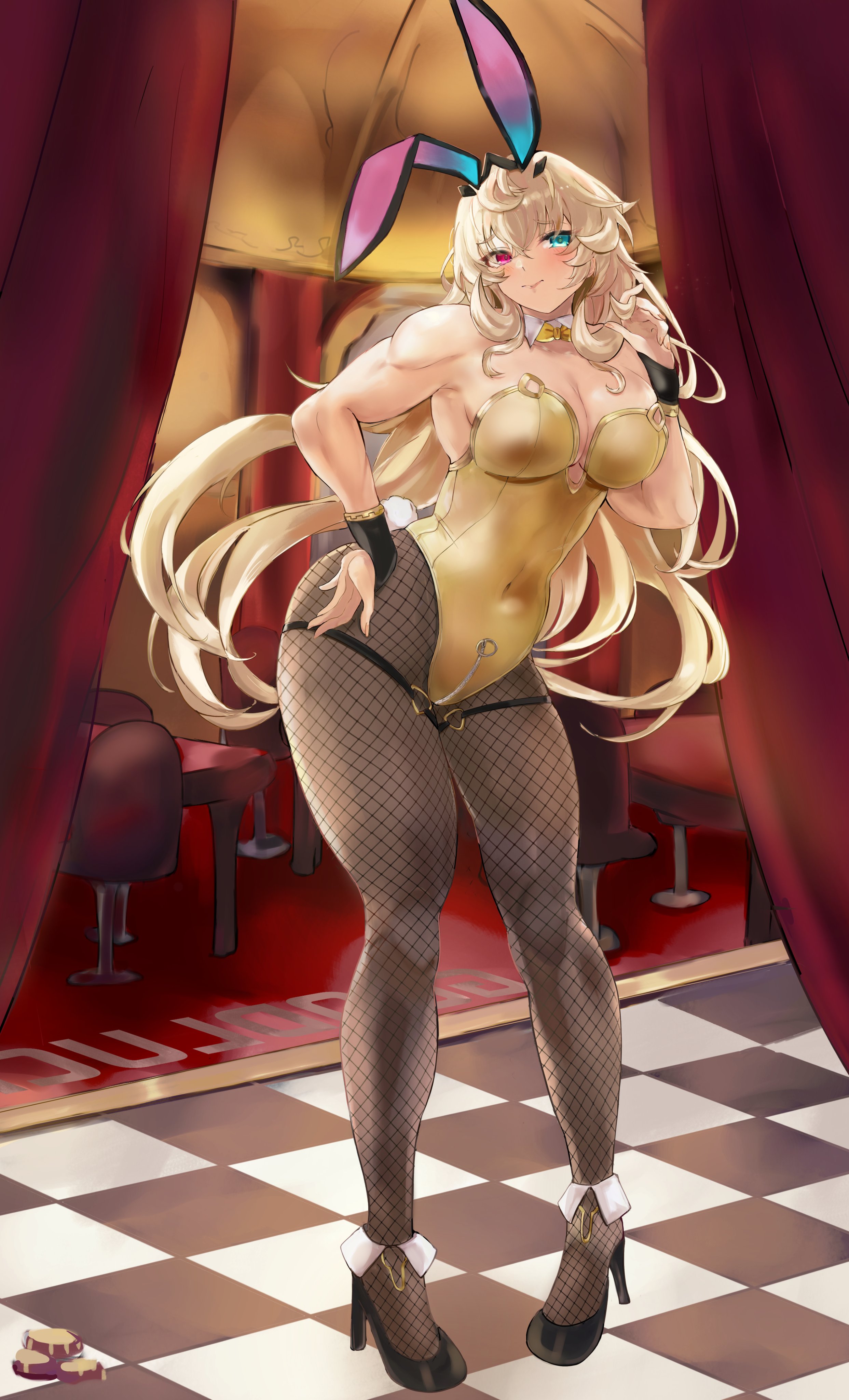 1girlalternate breast size (smaller)animal earsbare shouldersblonde hairblushbreastsbridal gauntletsbrown pantyhosecleavagecovered naveldetached collarfake animal earsfake tailfishnet pantyhosefishnetsfull bodygreen eyesheterochromiahigh heelshighleghighleg leotardlarge breastsleotardlong hairlooking at viewerpantyhoseplayboy bunnyrabbit earsrabbit tailred eyessolotailyellow leotard