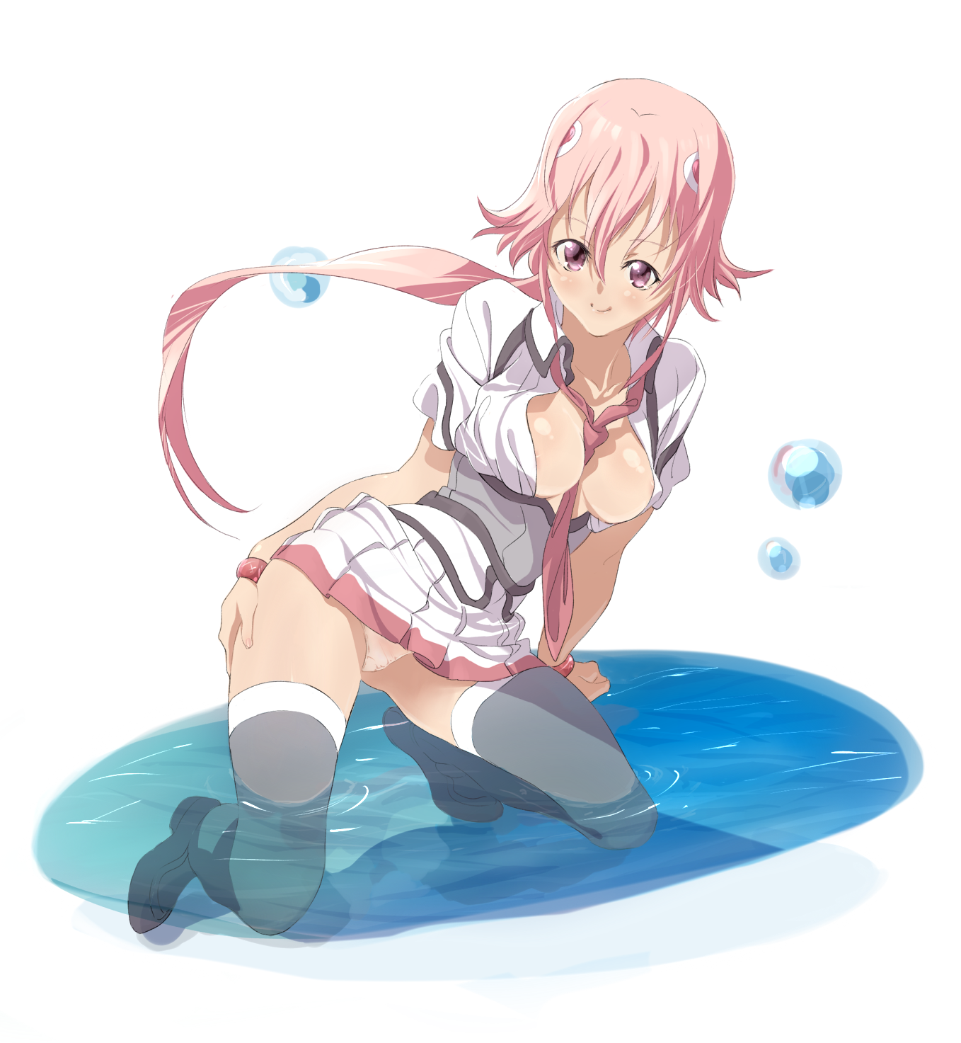 jinjin, traditional media, 1girl, black gloves, bottomless, breasts, brown hair, censored, christmas, female focus, gloves, green eyes, miniskirt, necktie, no panties, pussy, santa costume, skirt, solo, thighhighs