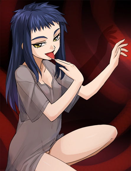 tagme, blue eyes, blue hair, hairband, long hair, midriff, pointing, solo