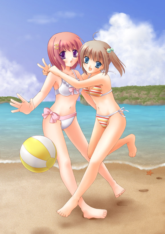 2girlsahogeballbarefootbeachbeachballbikiniblue eyesbrown hairdayfeetfootprintsfrilled bikinifrillshair bobbleshair ornamenthuglegslowlegmultiple girlsnavelopen mouthoutdoorspurple eyesred hairshort hairside-tie bikini bottomsmilestriped bikinistriped clothesswimsuitv