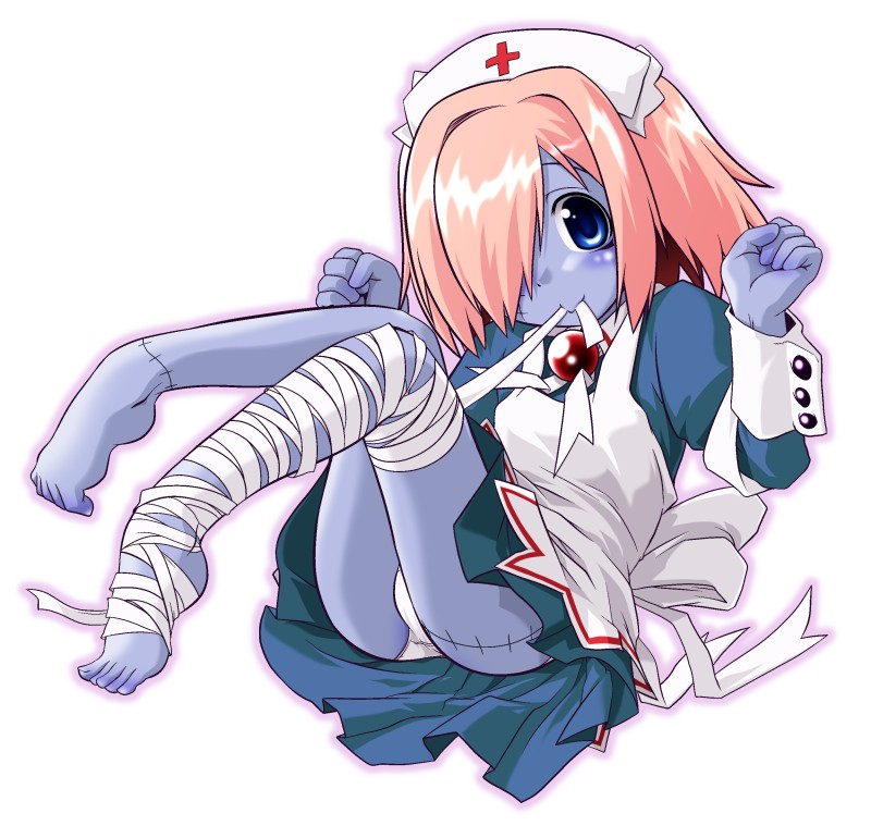 1girlbandagesbarefootblue eyesblue skincolored skinfeetfemale focushair over one eyemouth holdnursepantiespantyshotpink hairscarshort hairsolostitchesunderwearzombie