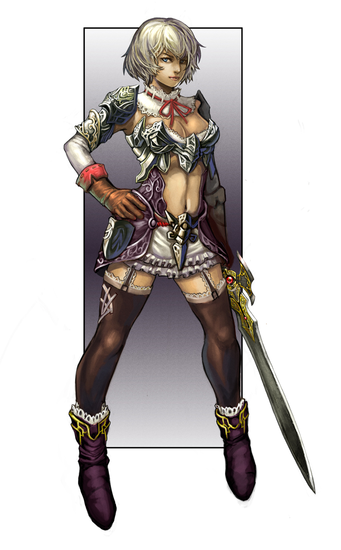 1girlblue eyesbootsfantasyfemale focusgarter beltgloveshand on own hiphip focusmidriffnavelshort hairsoloswordthighhighsweaponwhite hair