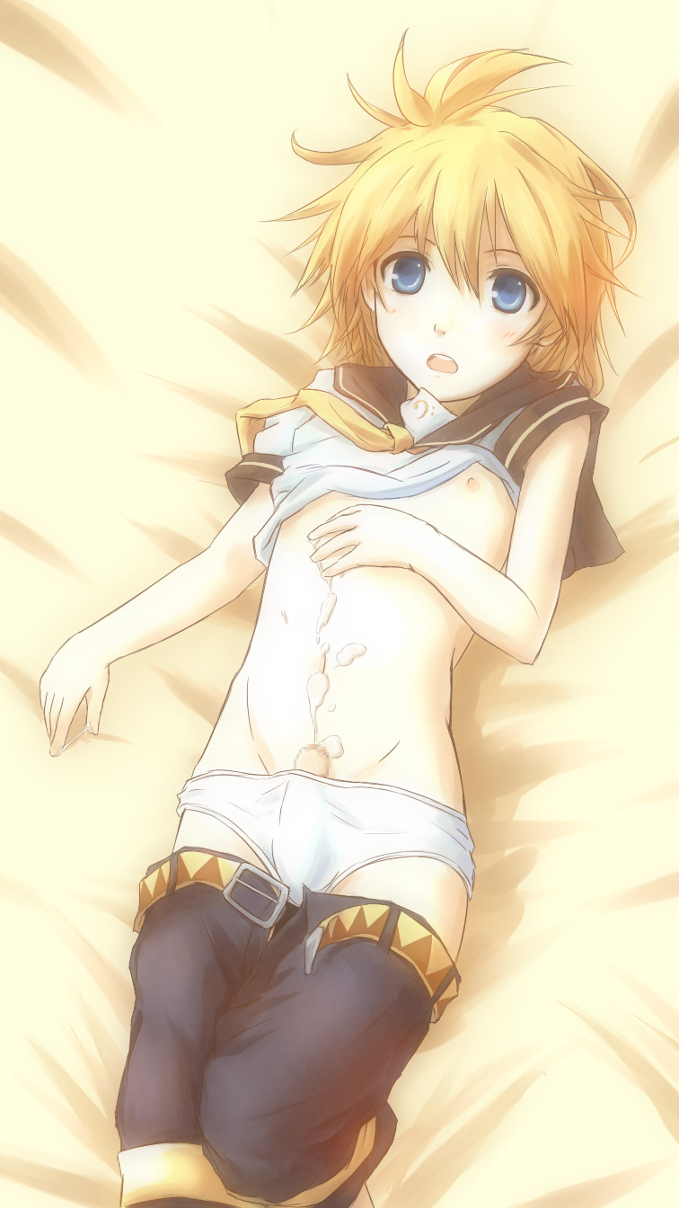 1boybedblonde hairblue eyesblushbriefscensoredcumforeskinlyingmale focusmale underwearmosaic censoringon backpenisshotasolounderwear