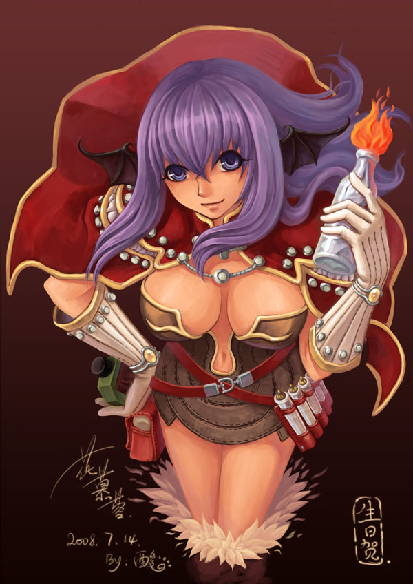 1girlacid demonstration(skill)bagblue eyesbottlebreastscapecleavagefemale focusfrom aboveglovesgradient backgroundhead wingslarge breastslong hairpurple hairsolowings