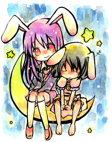 2girlsanimal earsbarefootchibifemale focusfull bodymoonmultiple girlsoutdoorsrabbit earssittingskysleeping