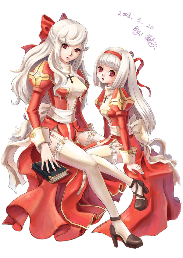 2girlsbookbowchildgarter belthair bowhair ribbonhigh heelslegslong hairmultiple girlsred eyesribbonshoessittingthighhighswhite hair