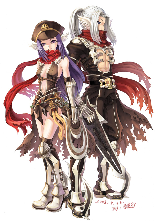 1boy1girlarmorbare shouldersbeltbreastscleavagedaggerhathead wingsjamadharknifelegslong hairmedium breastsponytailpurple hairscarftorn clothesweaponwhite hairwings