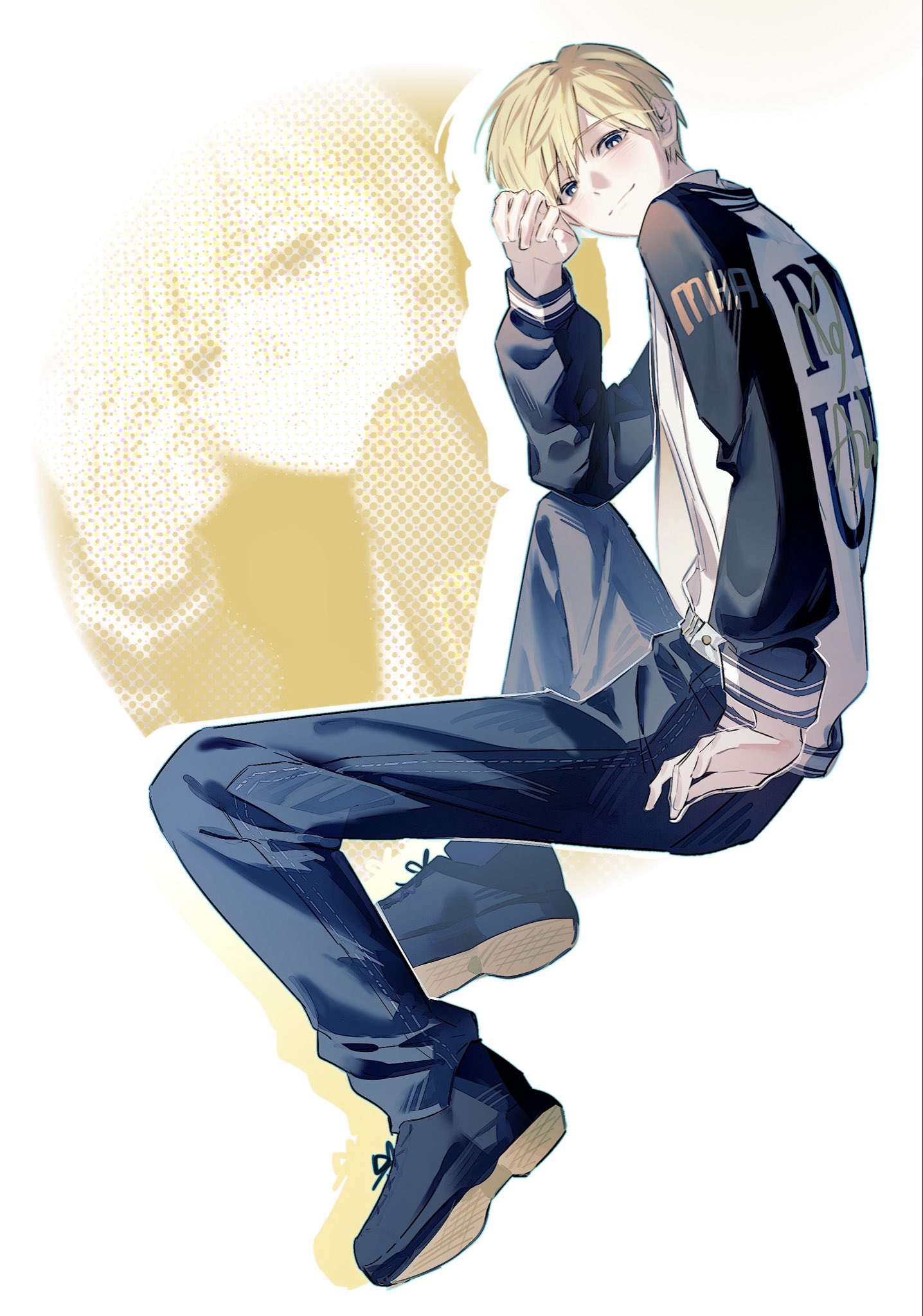 1boyblonde hairblue eyesblushdenimelbow on kneefrom sidefull bodyjacketjeanslight smilelong sleevesmale focusmonomaoishiipantsshort hair