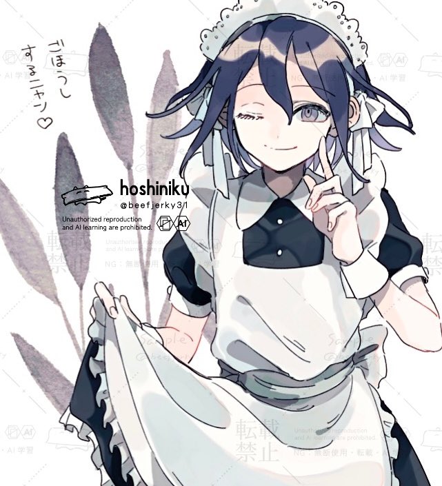 1boyalternate costumeapronartist nameblack dressbuttonsclothes liftcrossdressingcrossdressing (mtf)dressdress liftenmaidedeyelashesflipped hairfrilled apronfrilled dressfrillshair between eyesindex finger raisedlooking at viewermaidmaid apronmaid headdressmale focusmale maidone eye closedpuffy short sleevespuffy sleevespurple eyespurple hairringed eyesshort hairshort sleevessmilesolotwitter usernameupper bodywatermarkwhite apronwhite backgroundwrist cuffs