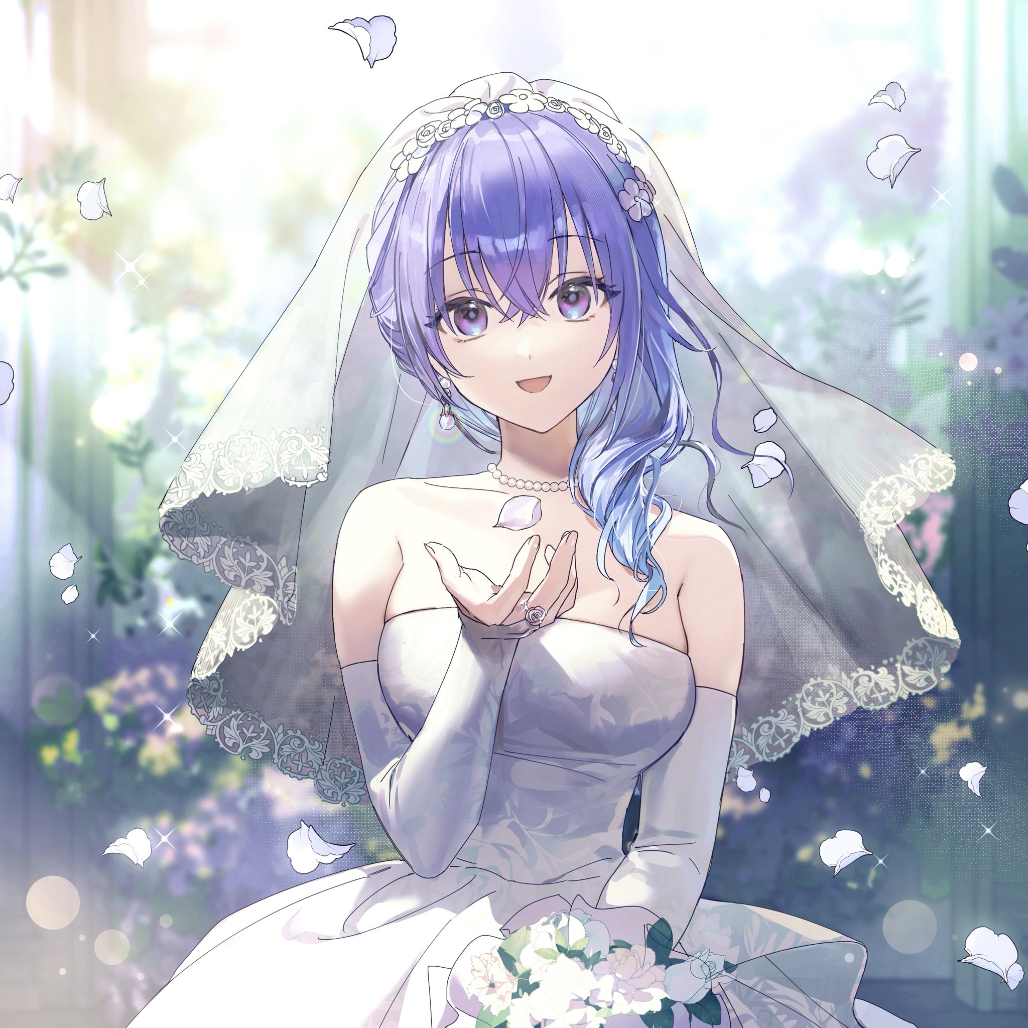 1girlbare shouldersblue hairblurryblurry backgroundbouquetbreastsbridal veilcollarbonedressearringselbow glovesfalling petalsflowergloveshair between eyesholdingholding bouquetjewelrylarge breastslong hairlooking at viewernecklaceopen mouthpearl necklacepetalspurple eyessmilesolostraplessstrapless dressveilwedding dresswhite dresswhite gloves