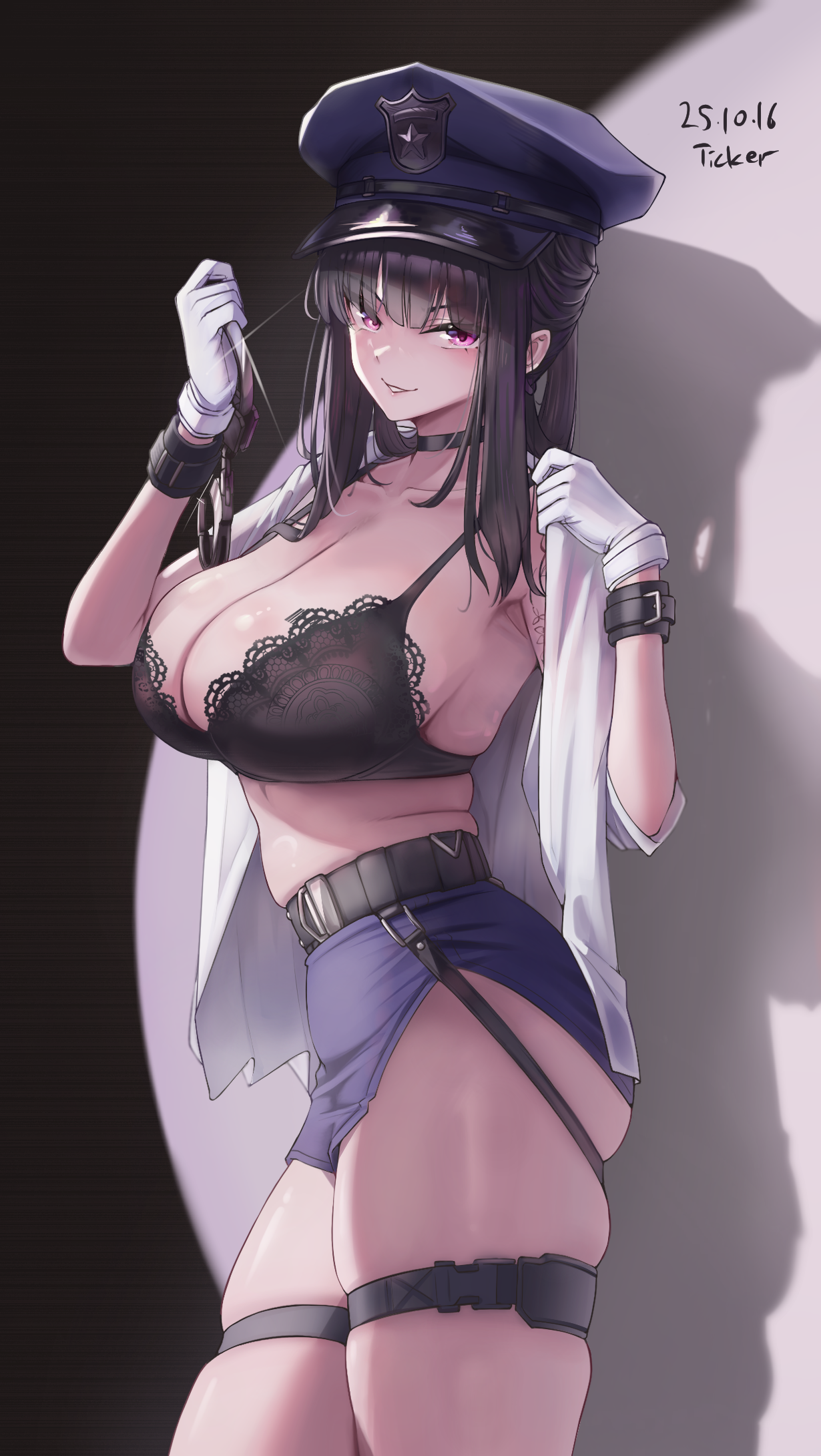 1girlblack brablack hairblue skirtbrabreastscuffsdatedgloveshandcuffshatholdingholding handcuffslarge breastslooking at viewermedium hairofficial alternate costumepolicepolice hatpolice uniformpolicewomanpurple eyesshirtskirtsolothigh strapthighsunderwearwhite gloveswhite shirt
