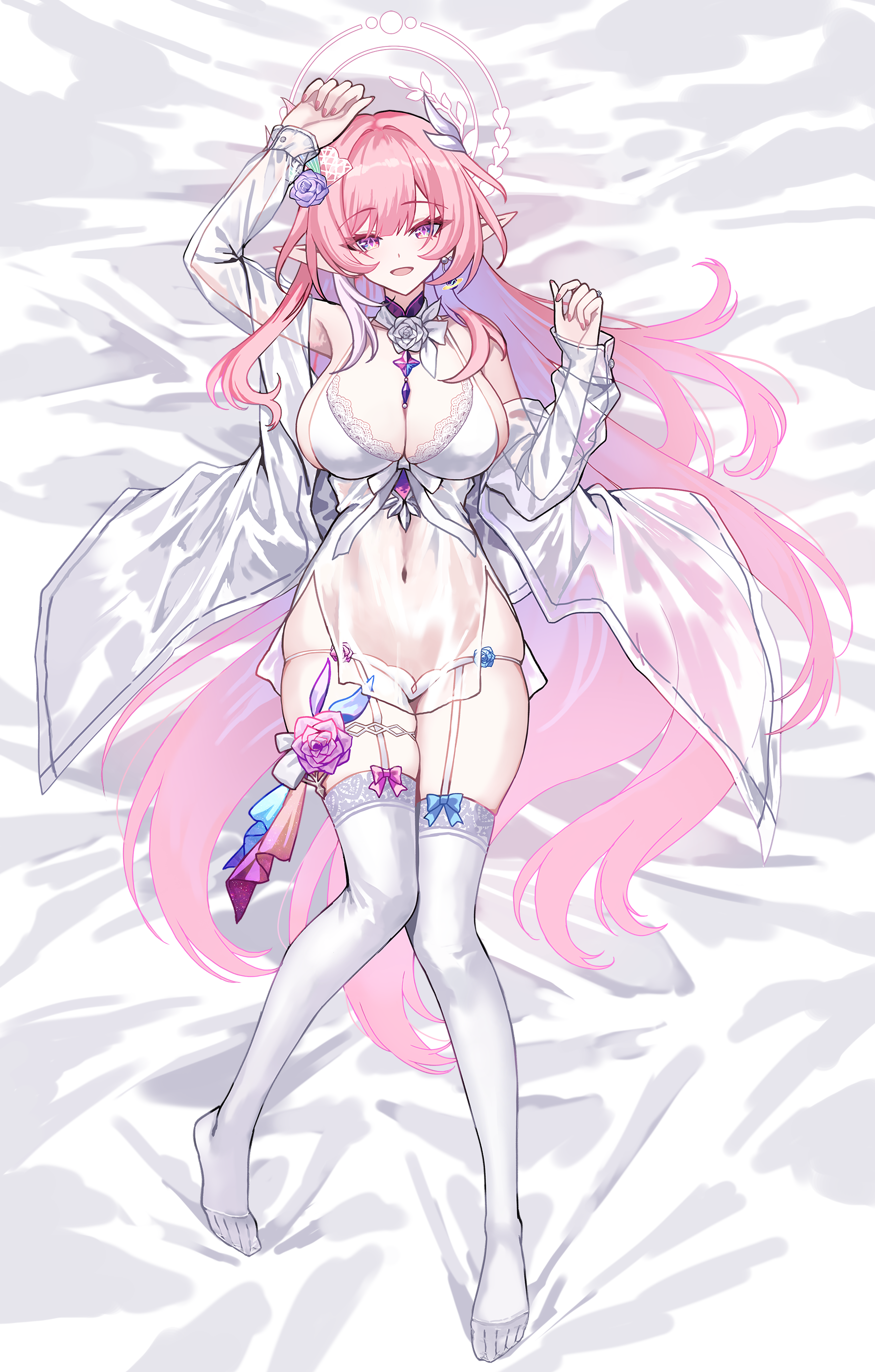 1girlalternate costumearm upbare shouldersbreastscleavagediamond (shape)diamond-shaped pupilsearringsfeetflowergarter strapshair flowerhair ornamenthand upjewelrylarge breastslong hairlong pointy earslooking at viewerlyingnail polishnavelno shoesoff shoulderon backopen clothesopen mouthopen shirtpantiespink hairpink nailspointy earspurple eyespurple flowerpurple roseroseshirtskindentationsmilesolostomachsymbol-shaped pupilsthighhighsthighstoesunderwearvery long hairwhite garter strapswhite pantieswhite shirtwhite thighhighs