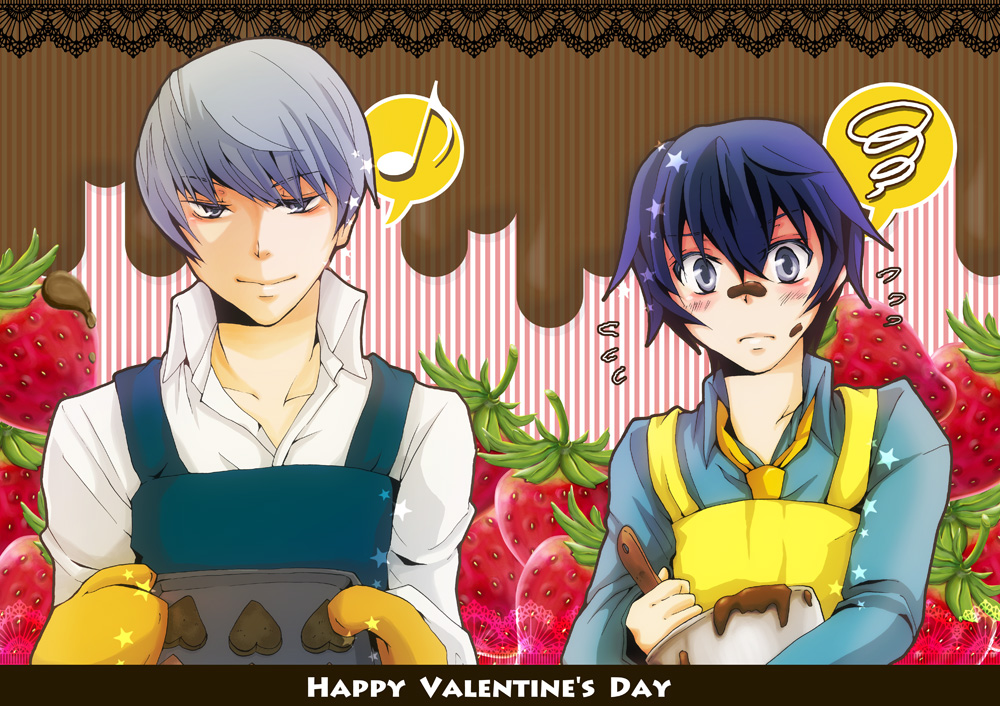1boy1girlandrogynousapronblue eyesblue hairblushchocolatecookingfoodfruithappy valentinereverse trapshort hairstrawberryvalentine