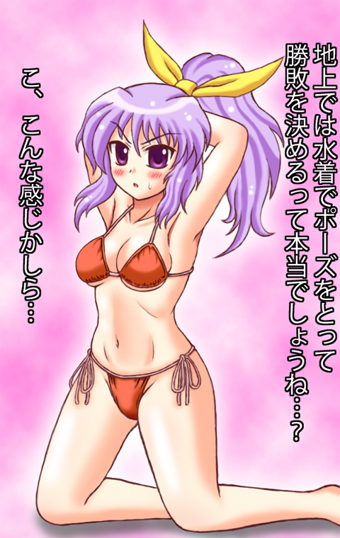 isa (ni-iro), miss surfersparadise, original, 1girl, beach, bikini, blonde hair, blue bikini, blue eyes, day, female focus, long hair, one eye closed, outdoors, ponytail, side-tie bikini bottom, solo, swimsuit, water gun, wink