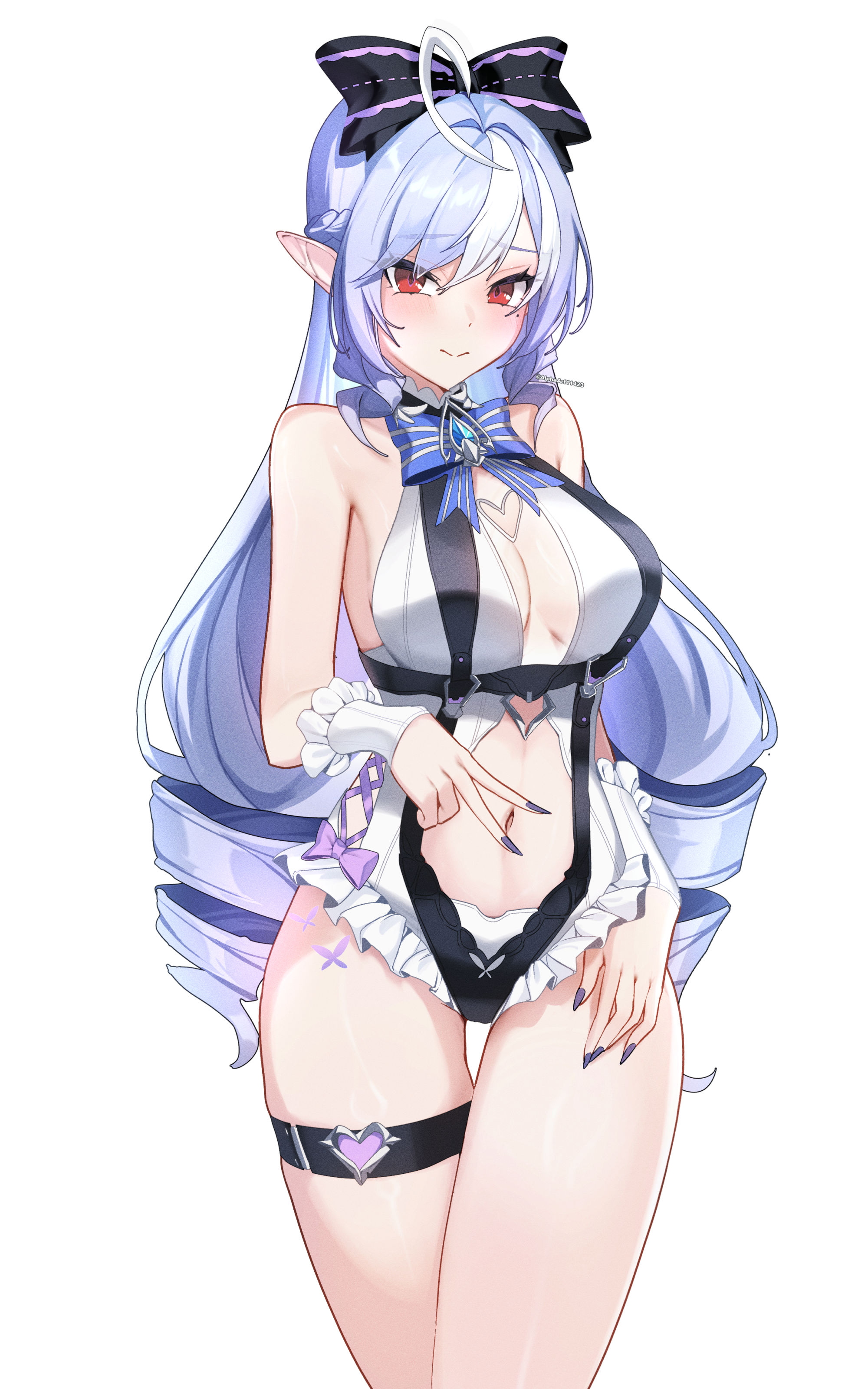 1girlahogebare shouldersblack bowbowbreastscasual one-piece swimsuitclosed mouthclothing cutoutfingernailshair bowhair intakesheart cutouthuge ahogelarge breastslong fingernailslong hairlooking at viewermolemole under eyemulticolored hairnail polishnavelofficial alternate costumeone-piece swimsuitpointy earspurple hairpurple nailsred eyessidelockssimple backgroundsolostomachstomach cutoutstreaked hairswimsuitthigh gapthigh strapthighsvvery long hairwhite backgroundwhite one-piece swimsuit