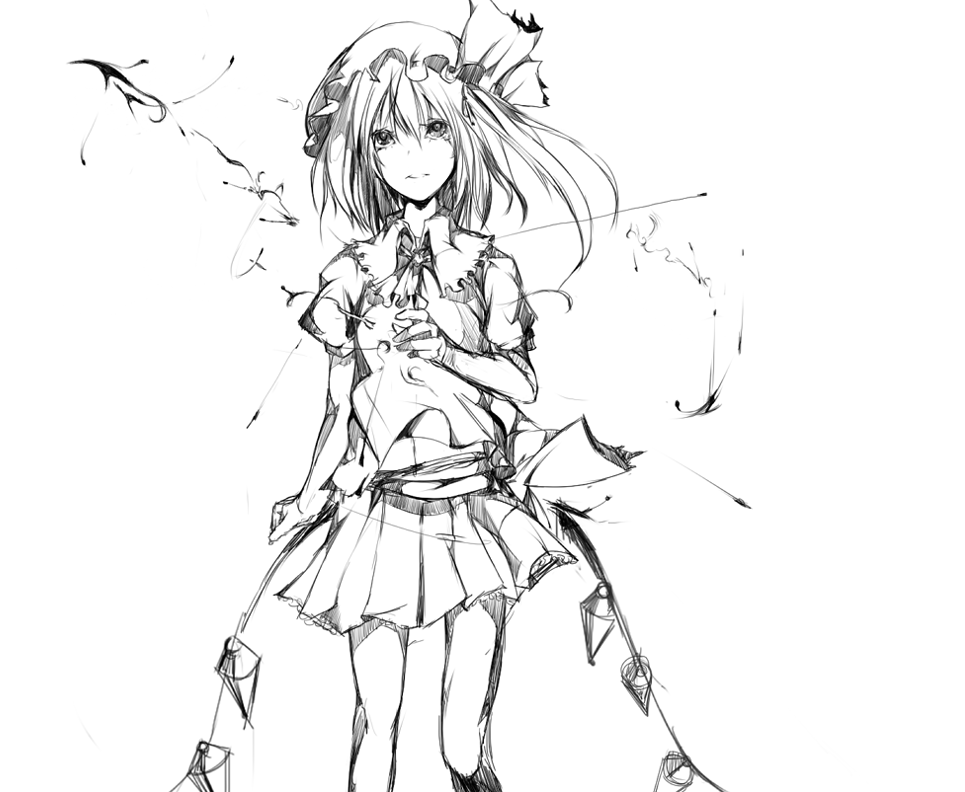 1girlcrystalfemale focusgreyscalehathat ribbonlooking at viewermob capmonochromepleated skirtribbonsimple backgroundskirtsolostandingwhite background