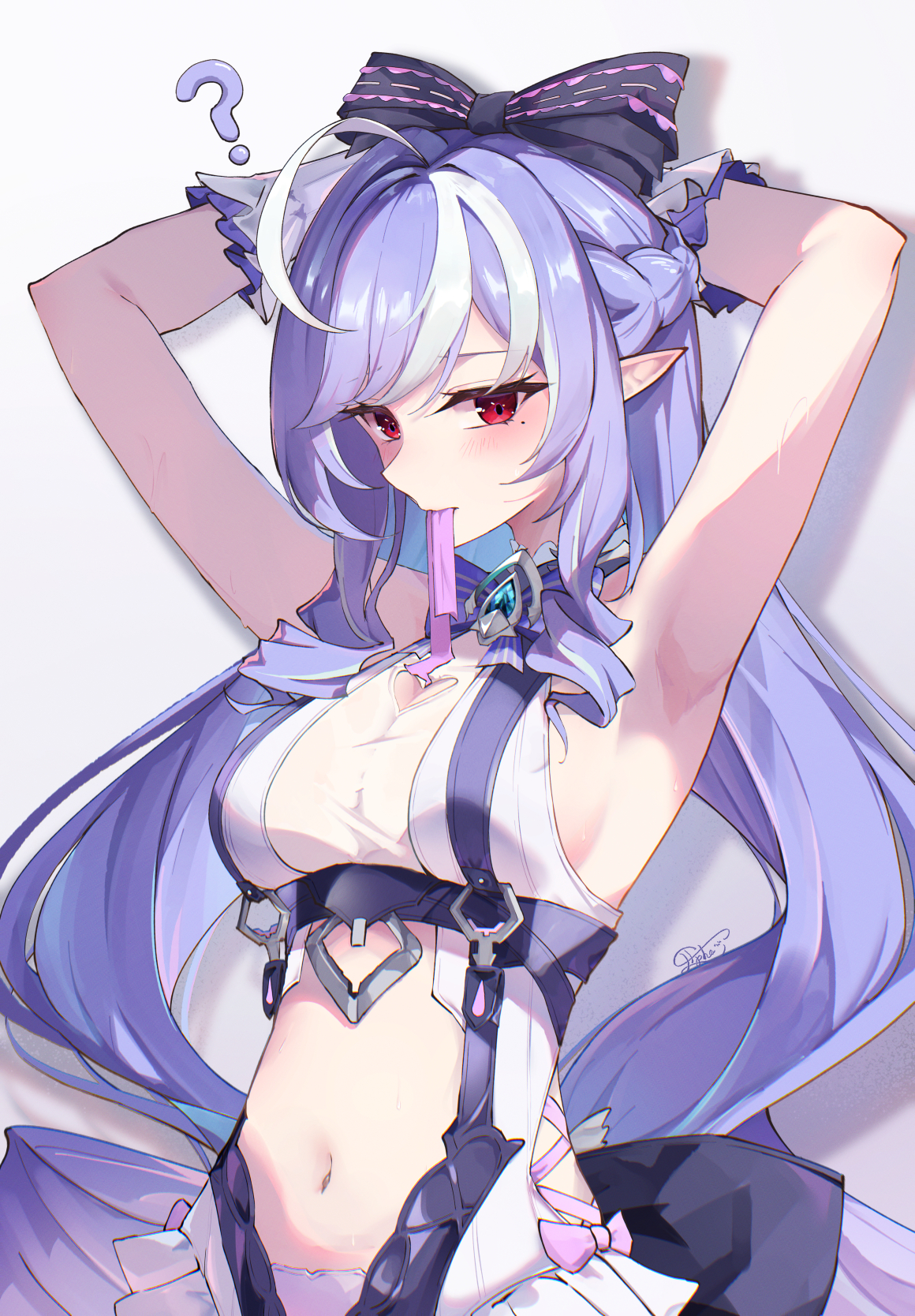 1boy1girlahogearmpit focusarmpitsarms upblushbowbreastsclothing cutouthair bowhalf updoheart cutoutlong hairlooking at viewermedium breastsmolemole under eyemouth holdmulticolored hairnavelofficial alternate costumeone-piece swimsuitpointy earspurple bowpurple hairred eyessidelockssignaturesolostomachstomach cutoutstreaked hairswimsuittying hairupper bodyvery long hairwhite one-piece swimsuit
