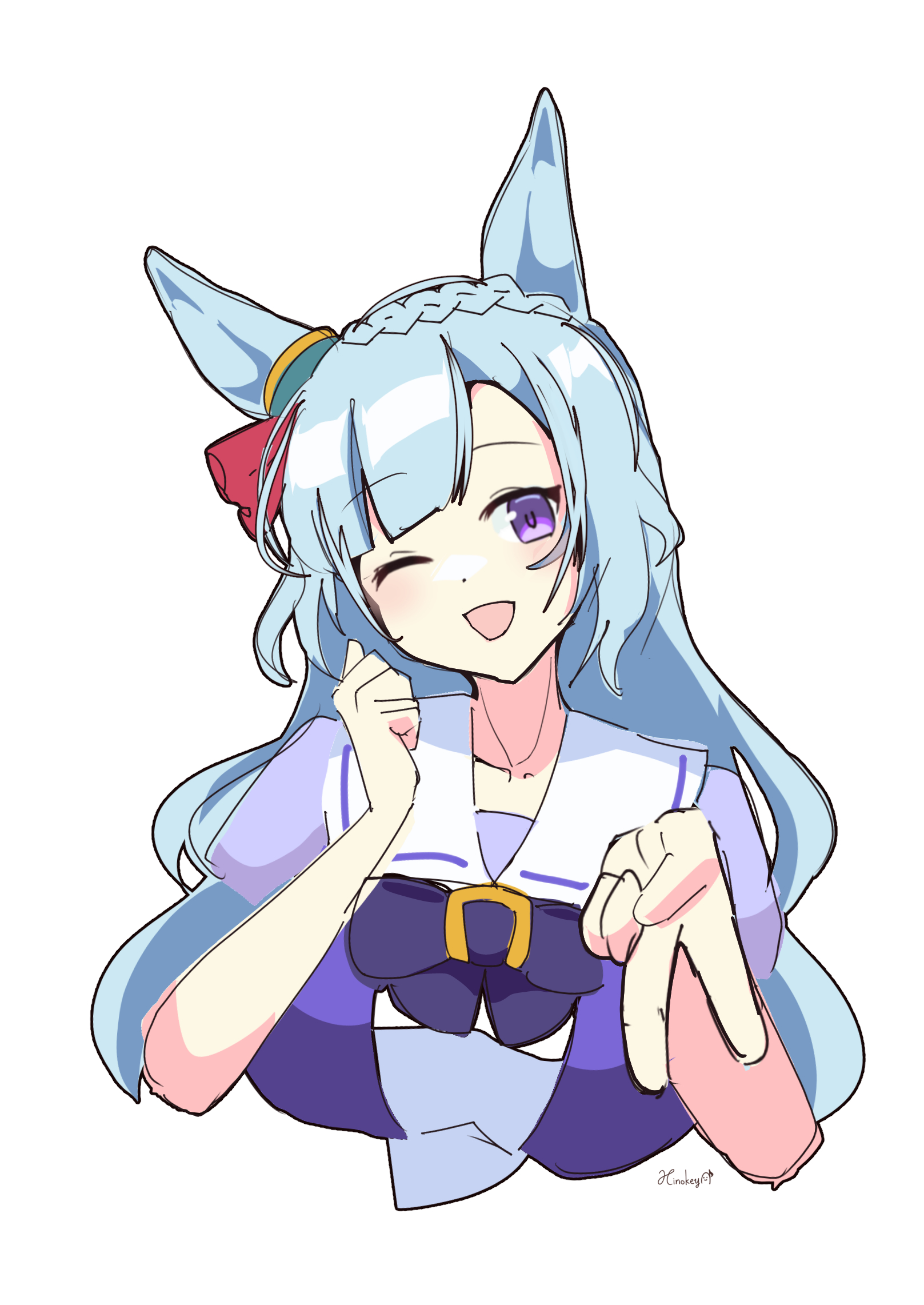 1girlanimal earsblue hairblushbowbowtiebraidbreastscrown braidear ornamenthorse earshorse girllarge breastslong hairlooking at viewerone eye closedopen mouthpuffy short sleevespuffy sleevespurple bowpurple bowtiepurple eyespurple shirtsailor collarsailor shirtschool uniformshirtshort sleevessimple backgroundsmilesolotracen school uniformupper bodyvwhite backgroundwhite sailor collar