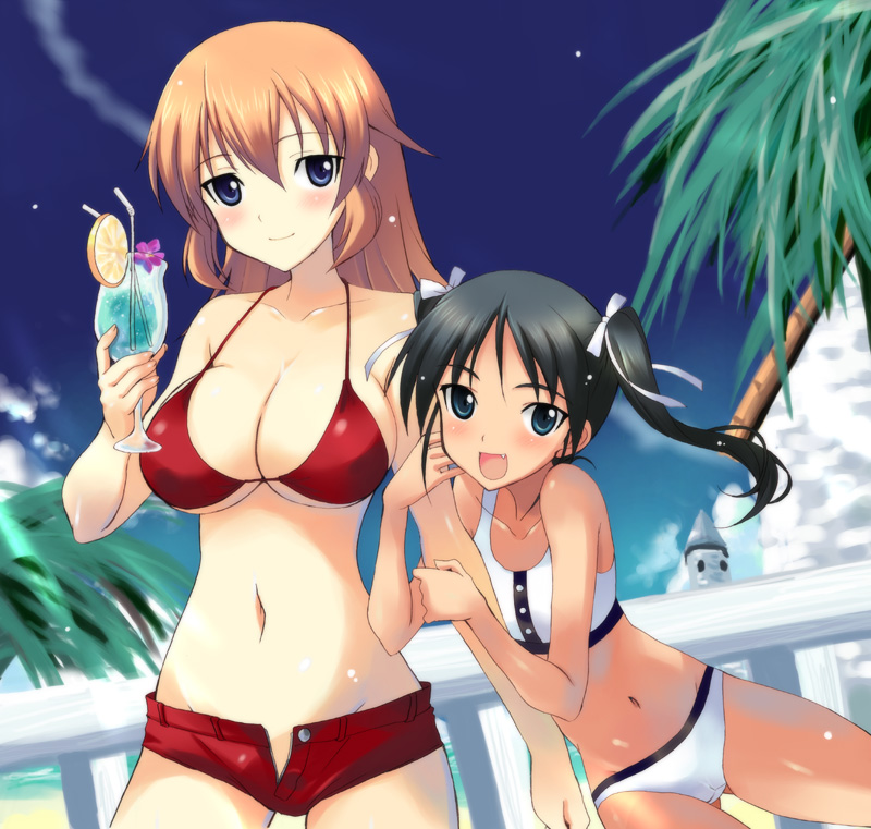 ogami kazuki, hinanawi tenshi, ibuki suika, touhou, translated, 2girls, blue hair, blush, female focus, flat chest, food, fruit, hat, horns, leaf, multiple girls, orange hair, peach, red eyes