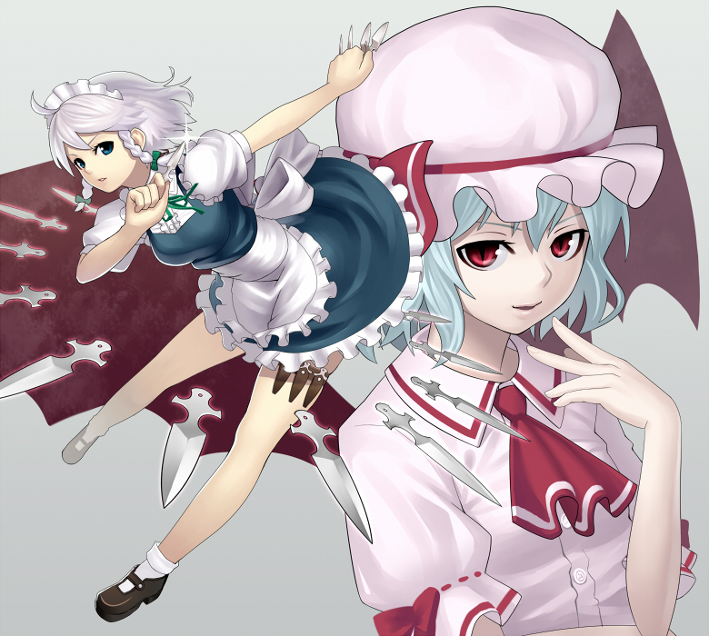 tatekawa mako, wnb mark, aquarian age, highres, 00s, 1girl, belt, blood, brown hair, demon tail, female focus, hairband, headband, long hair, maid, mouth hold, ponytail, purple eyes, solo, syringe, tail, thighhighs, zettai ryouiki