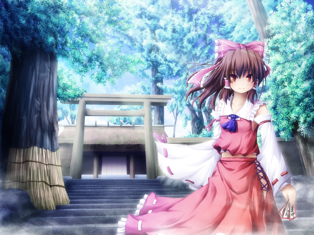 1girldetached sleevesfemale focusforestjapanese clothesmikonatureoutdoorsplantshrineskirtsolotorii