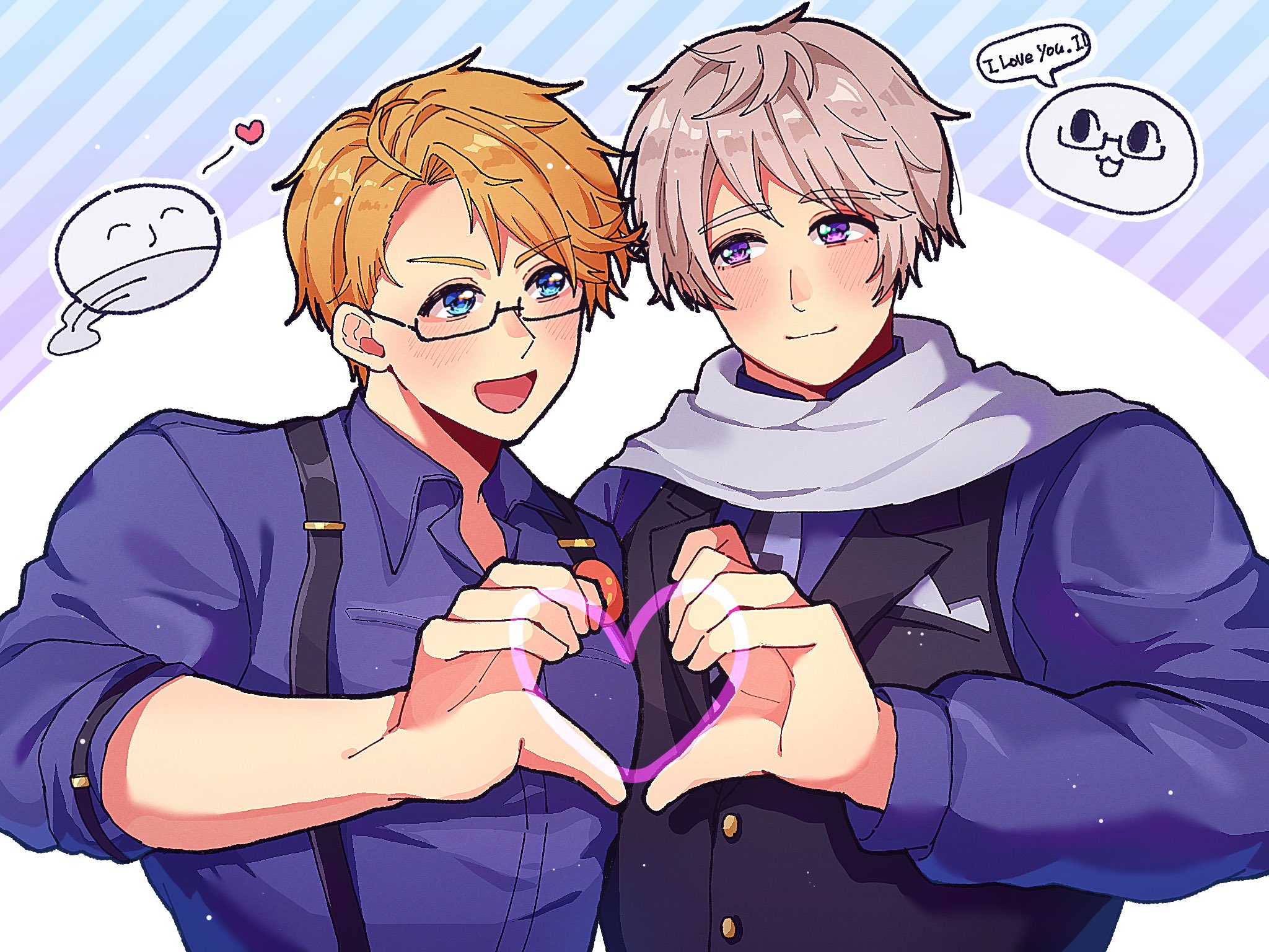 2boysahogeblack vestblack-framed eyewearblonde hairblue eyesblushbreast pocketclosed mouthenglish textglassesgrey hairhand uphandkerchiefhandkerchief in pocketheartheart handslapelslong sleeveslooking at anothermale focusmultiple boysnecktieopen mouthoutside borderpocketpuffy long sleevespuffy sleevespurple eyespurple necktiepurple shirtscarfsemi-rimless eyewearsenzodaidaishirtshort hairsimple backgroundsmilespeech bubblesuspendersupper bodyvestwhite backgroundwhite scarfyaoi