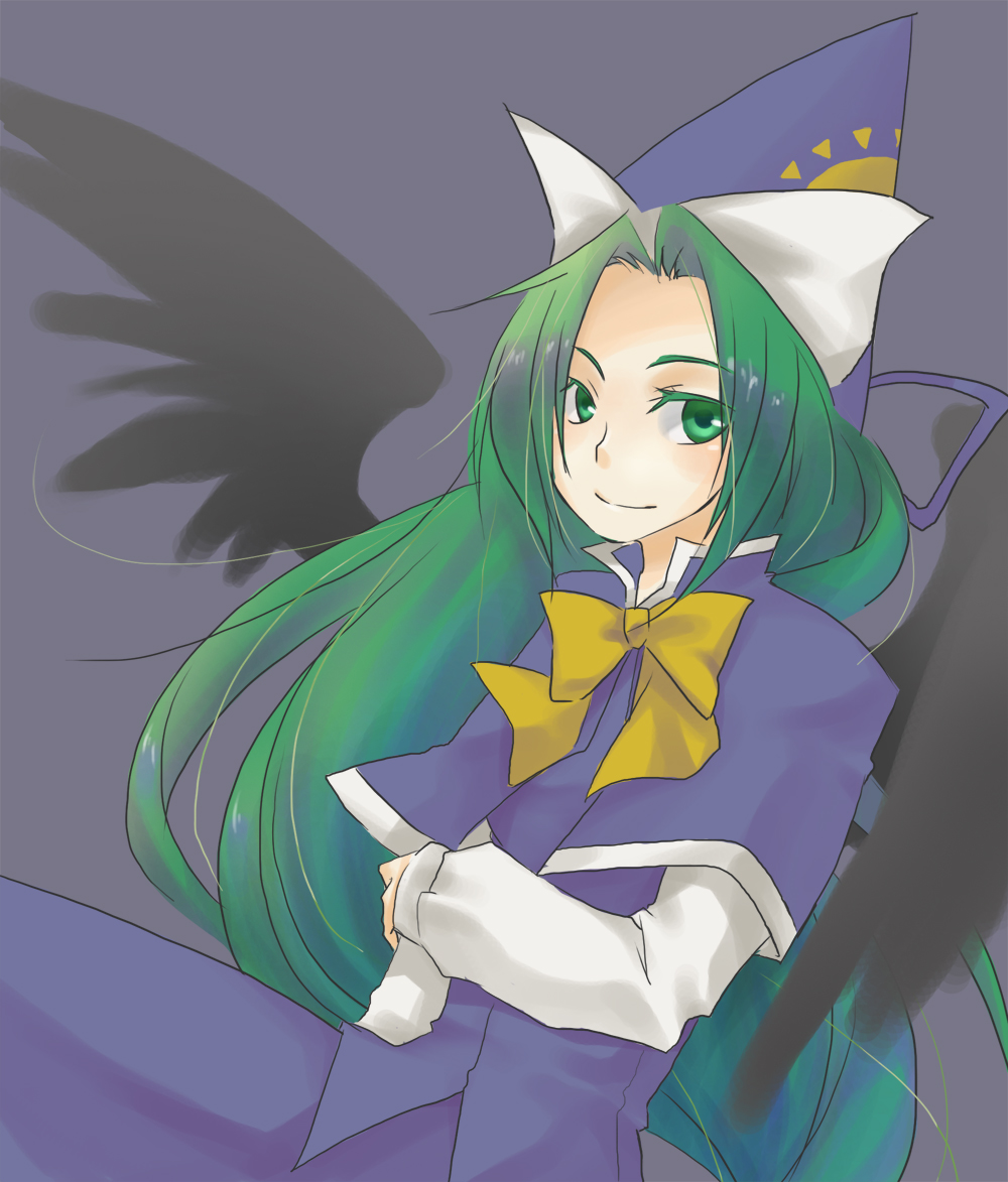 soresaki, komeiji koishi, touhou, highres, 1girl, bow, frilled sleeves, frills, green eyes, hat, hat bow, hat ribbon, long sleeves, looking at viewer, patterned background, ribbon, third eye, white hair
