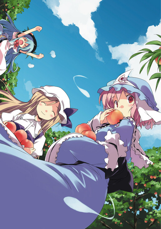 1boy3girlsclosed eyesdutch angleeatingfemale focusfoodfruithatholdingholding foodholding fruitmultiple girlspeach