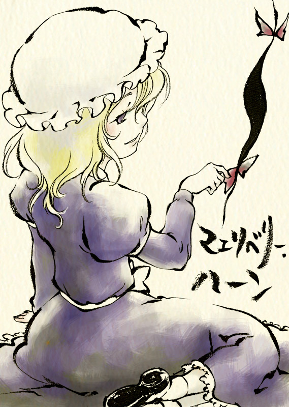 1girlarm at sideblack shoesblonde hairbowdressfemale focusfrilled hatfrillsfrom behindgap (touhou)hair between eyeshatjuliet sleeveslong hairlong sleevesmob capno pupilsprofilepuffy sleevespurple dresspurple eyesred bowshoe solesshoessimple backgroundsittingsockssolowhite hatwhite socksyellow backgroundyokozuwari