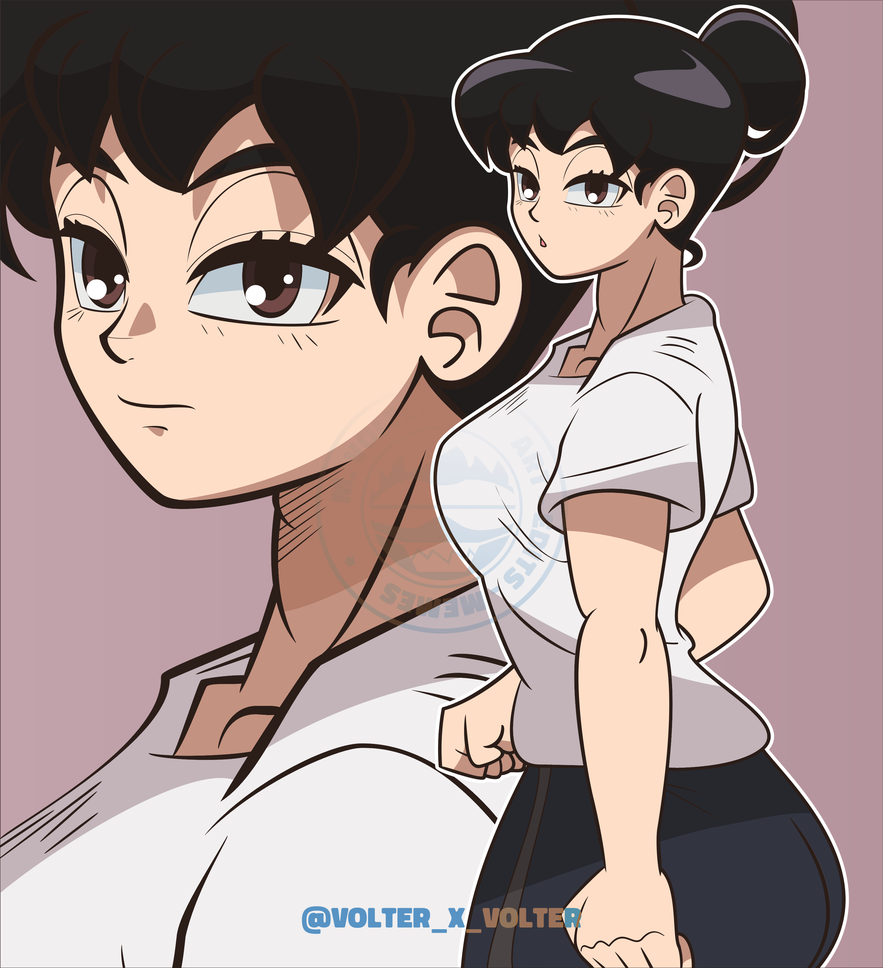 1girlassblack hairblack pantsbreastsbrown eyeshair bunlarge breastsmature femalepantspurple backgroundshirtshort hairtwitter usernamewatermarkwhite shirt