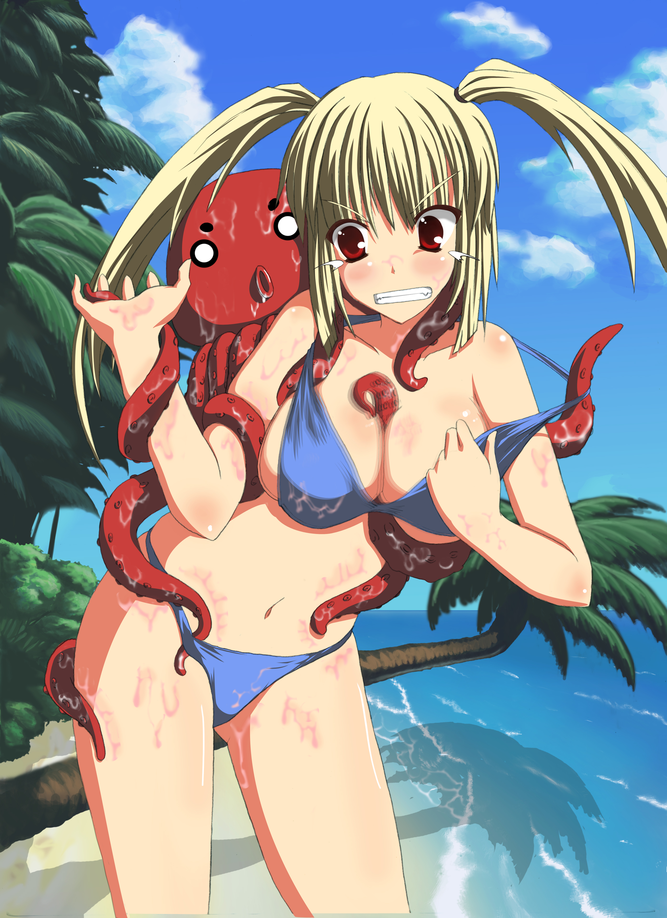 fei (maidoll), arato nagi, ruri no houseki, highres, 1girl, 3boys, bikini, bikini bottom aside, black bikini, black male underwear, boxer briefs, breasts, bulge, clothing aside, convenient censoring, cup, huge breasts, lying, male underwear, multiple boys, on back, panties, penis, penis grab, pitcher (container), surrounded by penises, swimsuit, underwear