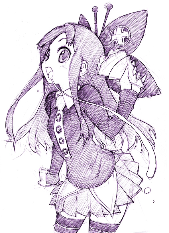1girlbowcrepedroolingfemale focusfoodhair bowmonochromeopen mouthsalivasimple backgroundsketchskirtsolothighhighszettai ryouiki