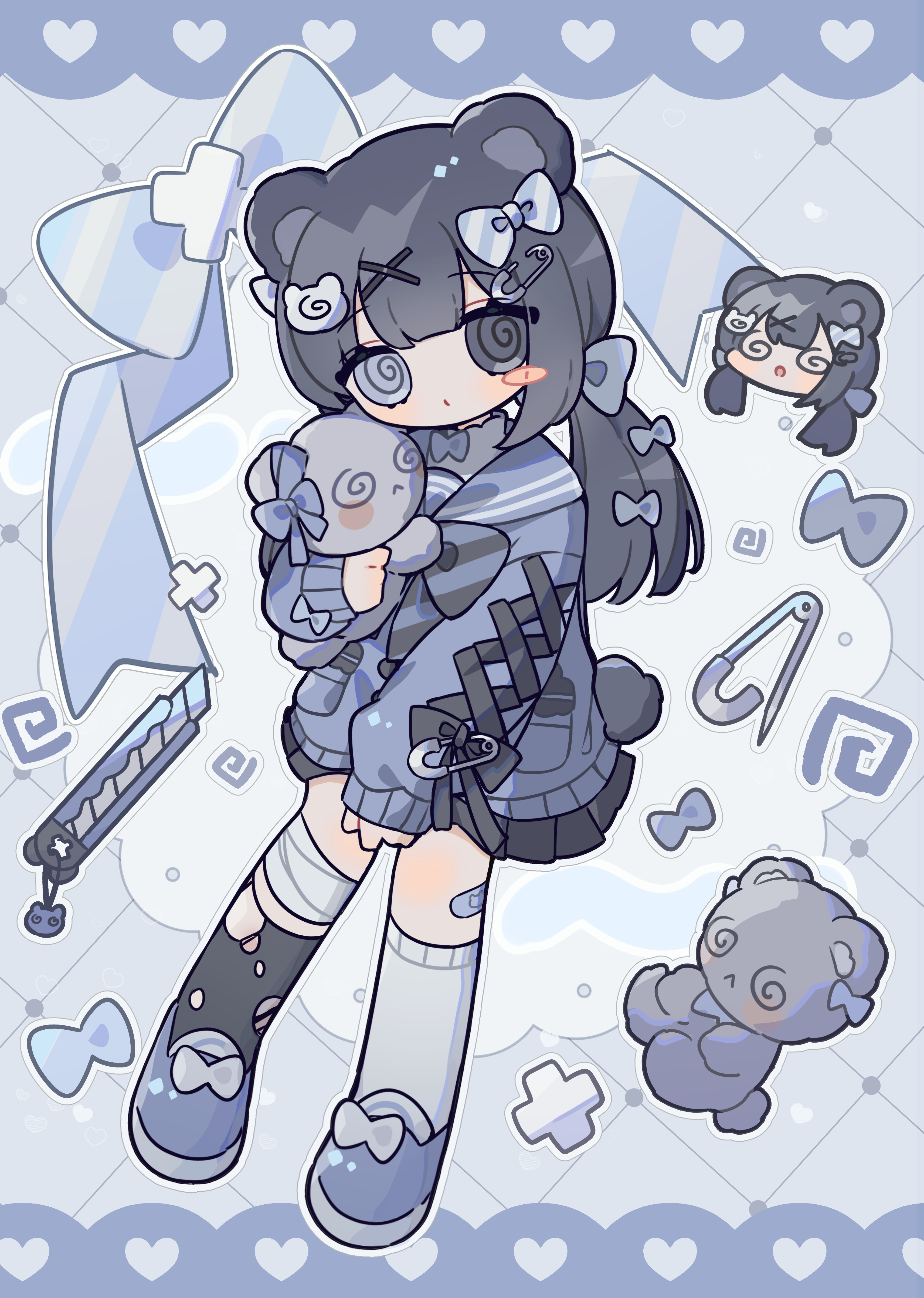 1boy1girlanimal earsasymmetrical legwearbear earsbear girlbear tailblack hairblack skirtblue eyesblue shirtblue shoesblush stickersbowboxcuttercross-laced clothescross-laced sleevesgrey eyeshair bowheterochromiaholdingholding stuffed toylong hairlong sleeveslooking at viewerlow twintailsminiskirtmismatched legwearpleated skirtrimeosafety pinschool uniformserafukushirtshoessingle blush stickerskirtsockssolostuffed animalstuffed toytailteddy beartwintailswhite bowwhite socks