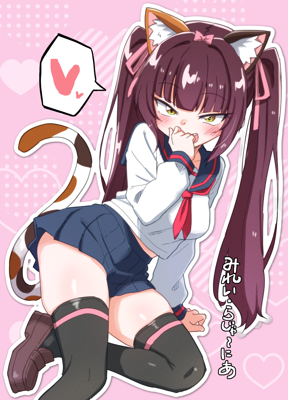 :d1girlanimal ear fluffanimal earsblack thighhighsblue sailor collarblue skirtblunt bangsblushbreastsbrown hairbrown shoescalico (pattern)cat earscat girlcat tailfangfoot out of framehair ribbonhand upheartloaferslong hairlooking at viewermedium breastsneckerchiefopen mouthoutlinepink backgroundpink ribbonpleated skirtred neckerchiefribbonsailor collarschool uniformserafukushirtshoessittingskirtsmilesolospoken hearttailthighhighstwintailswhite outlinewhite shirtyellow eyes