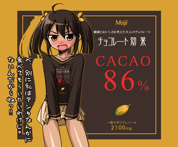 1girlblushbrown haircasualchocolatedark skindark-skinned femalefemale focusfood-themed clothesorange eyesorange themepersonificationshort hairsolotsunderetwintails