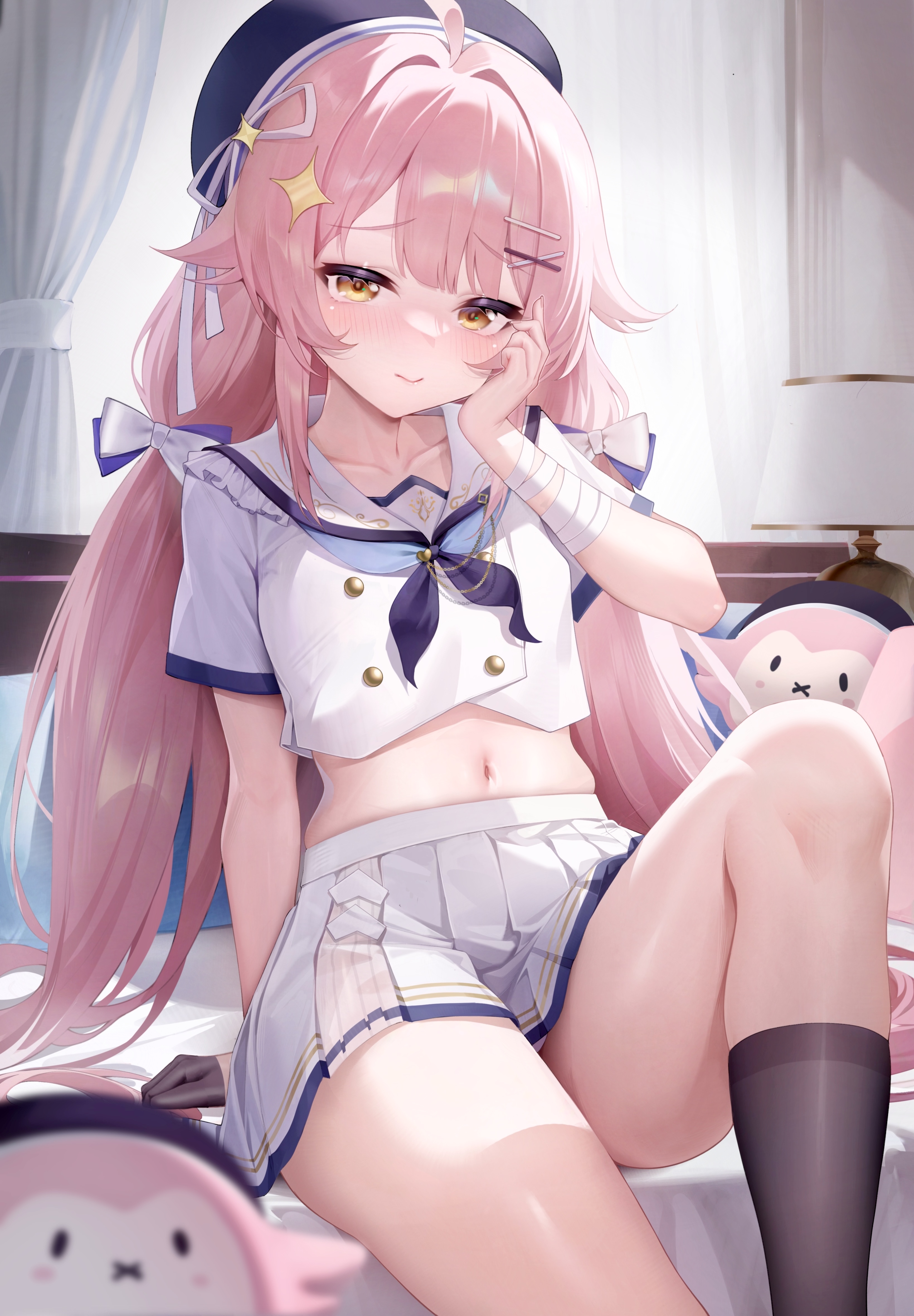 bow (bhp), original, highres, 1girl, ahoge, fang, female focus, hand fan, japanese clothes, kimono, long hair, paper fan, pink eyes, pink hair, sitting, smile, solo, uchiwa, veranda