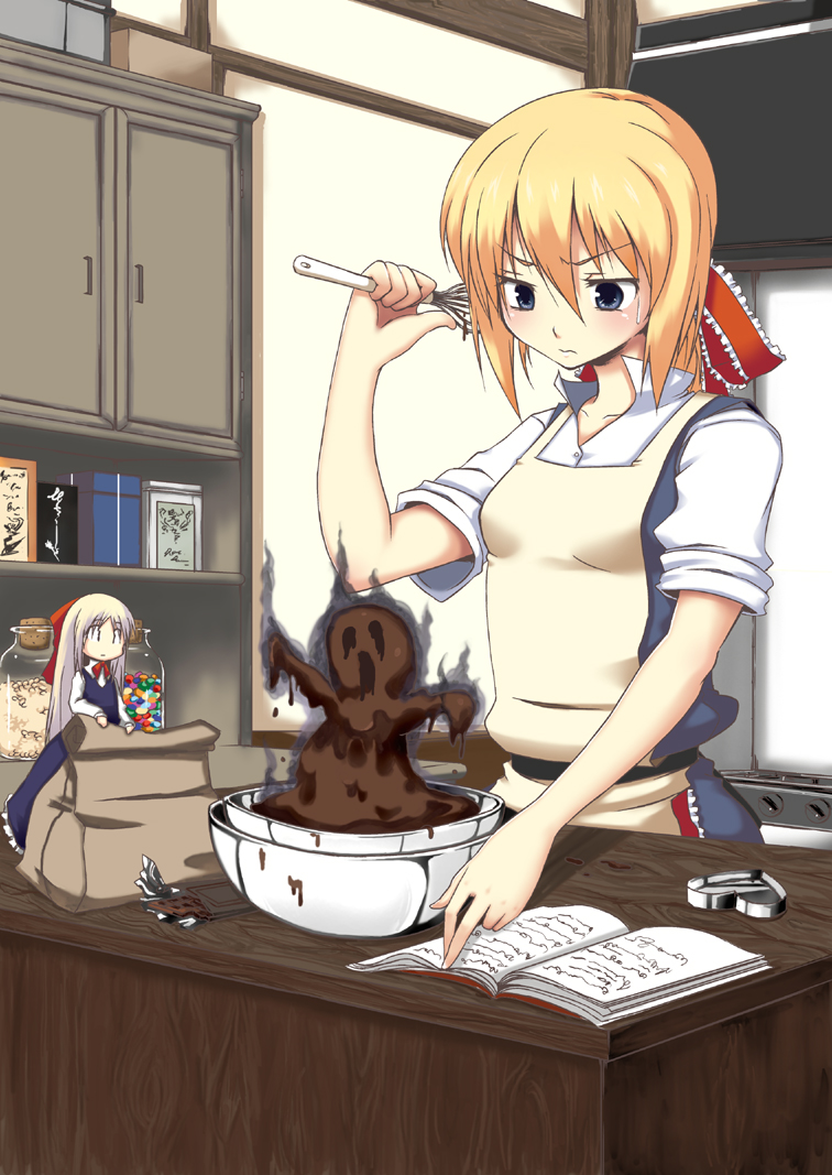 1girlalternate hairstyleapronbad foodbagblonde hairblue eyesbookcandychocolatechocolate barchocolate makingcookingcupboarddeskdollfailurefemale focusfoodhair ribbonheartindoorslong hairmixing bowlpaper bagpossessedribbonshort hairsleeves rolled upsolosweatdropvalentinewhisk