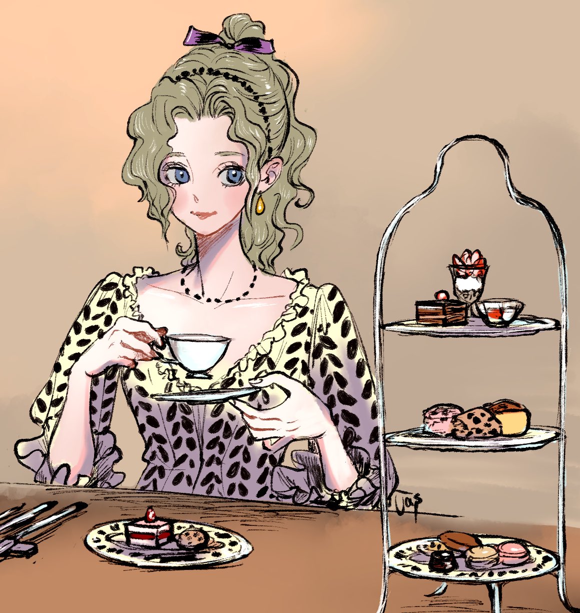 1girlalternate costumeblonde hairblue eyesbreastscupdessertearringsfancy dessertfoodfrilled sleevesfrillshair ribbonholdingholding cupholding saucerjewelrymedium breastsparted bangsponytailprint shirtpurple ribbonribbonsaucershirtsoloteacupupper bodywavy hair