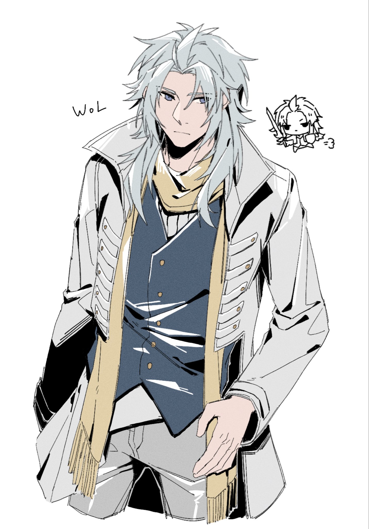 1boycharacter namechibichibi insetclosed mouthcoatcowboy shotcropped legsdissidia duellum final fantasygrey hairgrey pantsgrey vestholdingholding swordholding weaponlong coatlong hairmale focusofficial alternate costumeooabutterpantsparted lipsscarfshirtsoloswordvestwaistcoatweaponwhite backgroundwhite coatwhite shirtyellow scarf