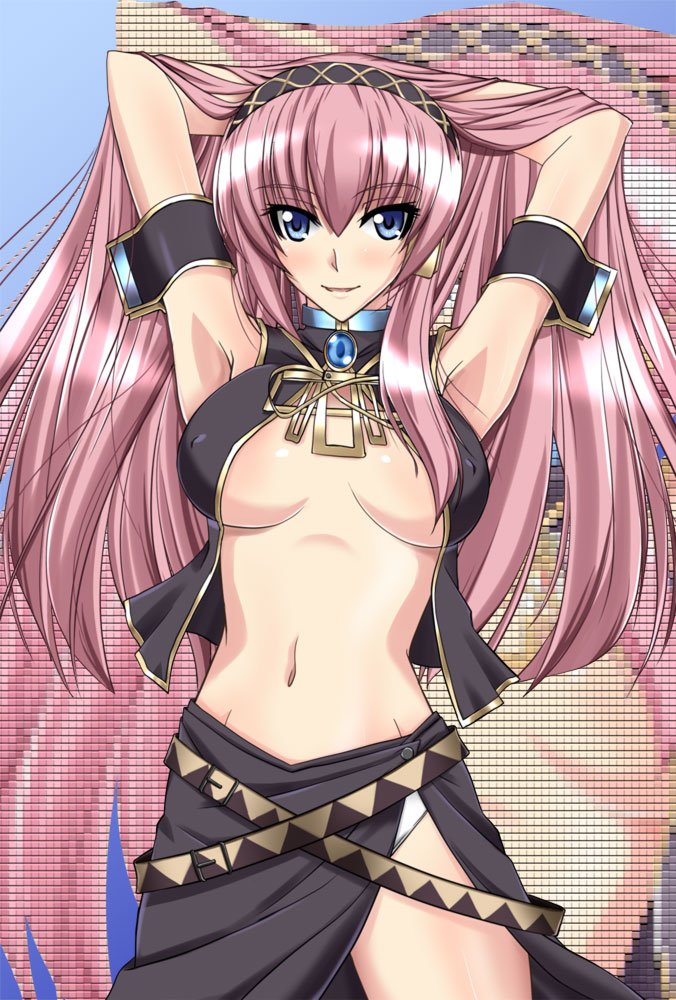 :d1girladjusting hairarmbandarmpitsarms upbeltblack skirtblue eyesblue gemstoneblushbreastsbreasts apartbroochcleavagecovered erect nipplesfemale focusgemheadphonesjewelrylarge breastslong hairlong skirtlooking at viewermidriffmultiple beltsnavelno braopen clothesopen mouthpantiespink hairpixel layerpixelatedside slitskirtsleevelesssleeveless turtlenecksmilesolostandingturtleneckunderwearvery long hairwhite pantieszoom layer