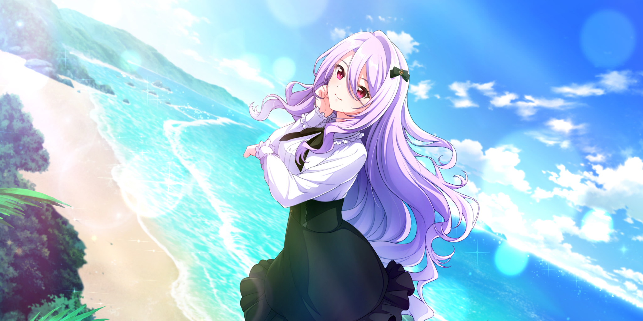 1girlbeachblack bowblack skirtblue skybowbreastsbuttonsclosed mouthcloudcowboy shotdaydot nosedutch anglefrilled shirtfrillshair between eyeshair bowhand on own cheekhand on own facehead tilthorizonlens flarelong hairlong sleeveslooking at viewermedium breastsoceanoutdoorspurple hairred eyesshirtskirtskysmilesolosparklevery long hairwhite shirt