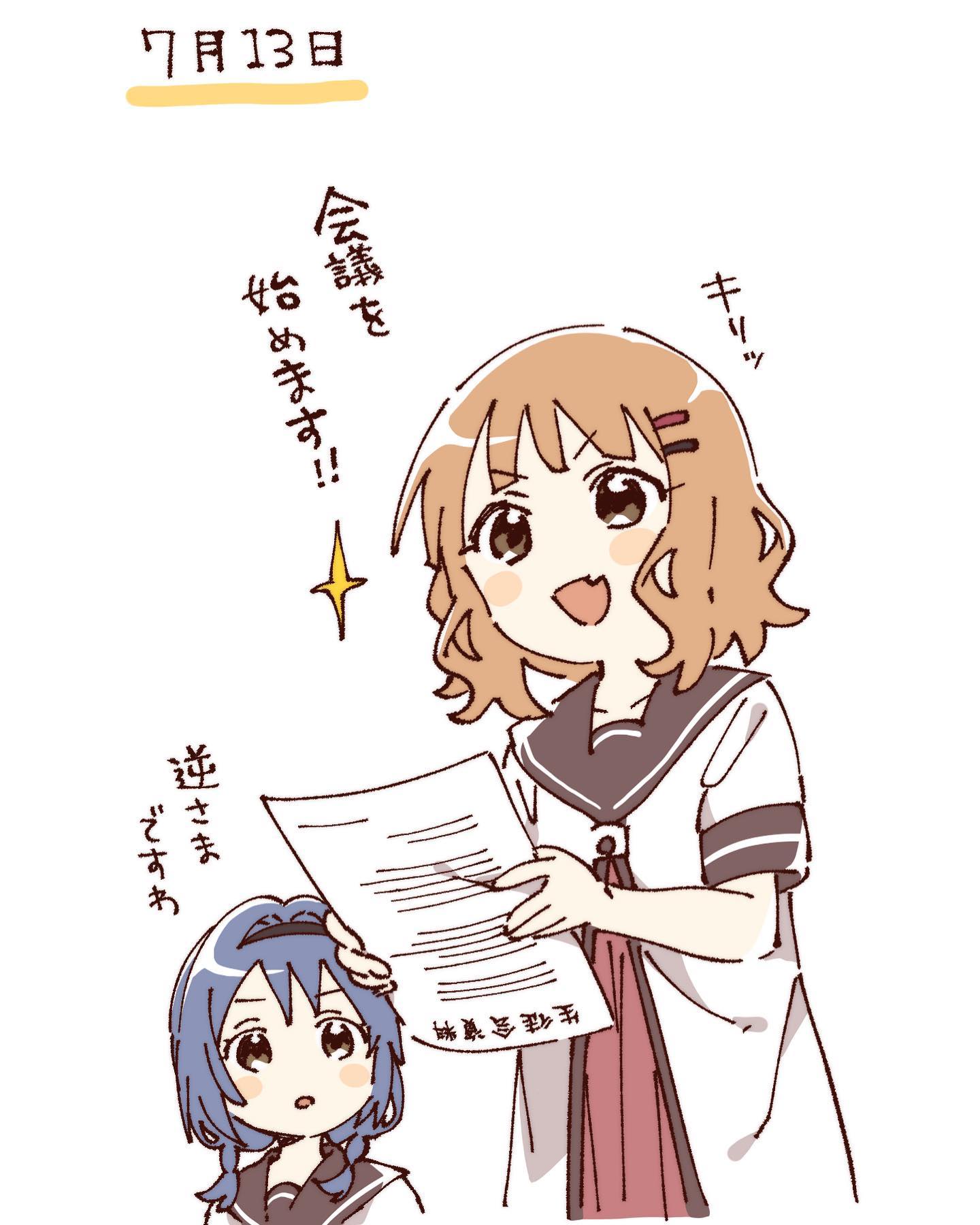 :d2girlsblack hairbandblue hairblush stickersbrown eyesbrown hairbrown sailor collarcropped torsodressfanghair ornamenthairbandhairclipholdingholding papermultiple girlsnanamori school uniformopen mouthpaperparallel hairclipspleated dressred dresssailor collarschool uniformshirtshort hairshort sleevessimple backgroundsmilesparklesummer uniformv-shaped eyebrowswhite backgroundwhite shirt