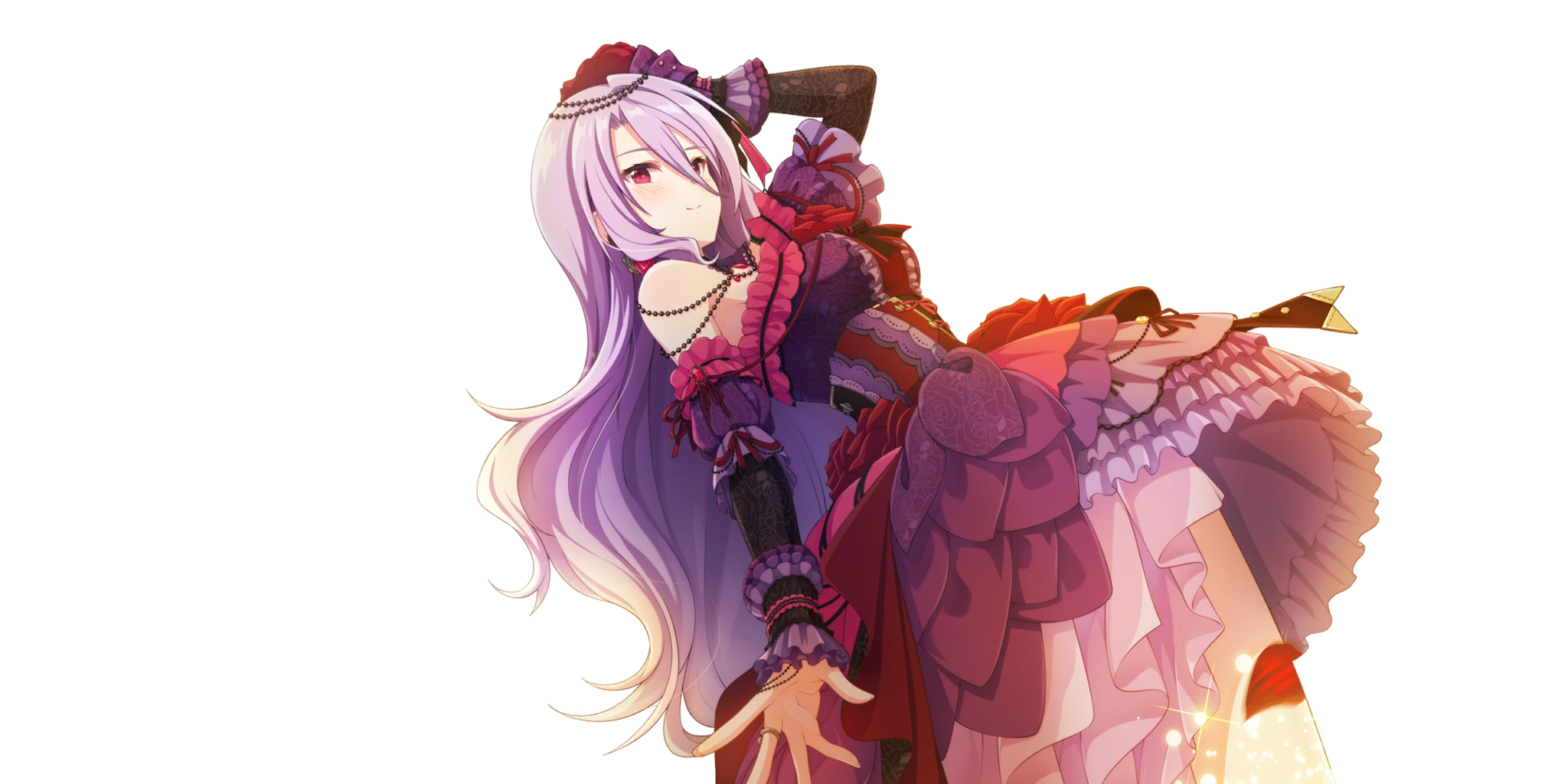 1girlarm upblack sleevesbreastsclosed mouthcorsetcowboy shotdetached sleevesdressfalling petalsfloral printfloral print dressfrilled skirtfrillshair between eyeshand on own headjewelrylayered skirtlong hairmedium breastspetalsprint dresspurple dresspurple hairpurple sleevesred corsetred eyesred petalsringrose printsimple backgroundsingle bare shoulderskirtsmilesolosparkletransparent backgroundunderbustvery long hair