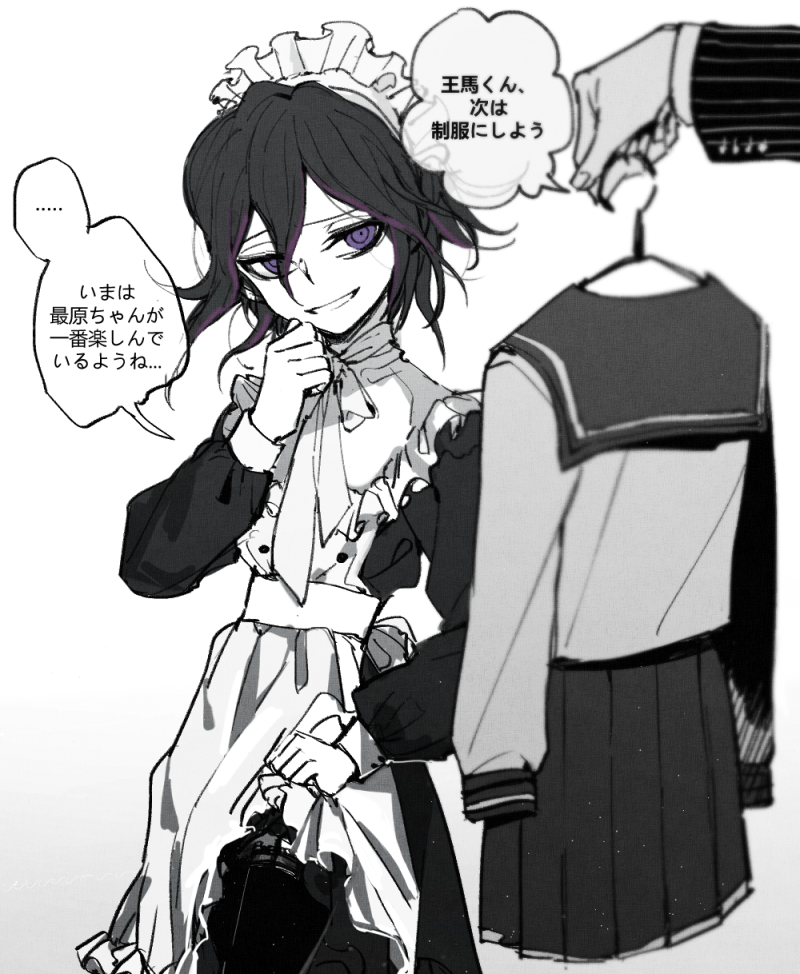 2boysalternate costumeapronblack dressblack hairchugiyaclothes hangerclothes liftcrossdressingcrossdressing (mtf)dressdress liftenmaidedflipped hairfrilled apronfrillsgreyscalehair between eyeshand on own chinholdingholding clothes hangerlight particleslong sleevesmaidmaid apronmaid headdressmale focusmale maidmonochromemultiple boyspinstripe jacketpinstripe patternpurple eyespurple hairringed eyessailor collarschool uniformshort hairsmirksolo focusspeech bubblespot colorthighhighstrapunworn clotheswhite background