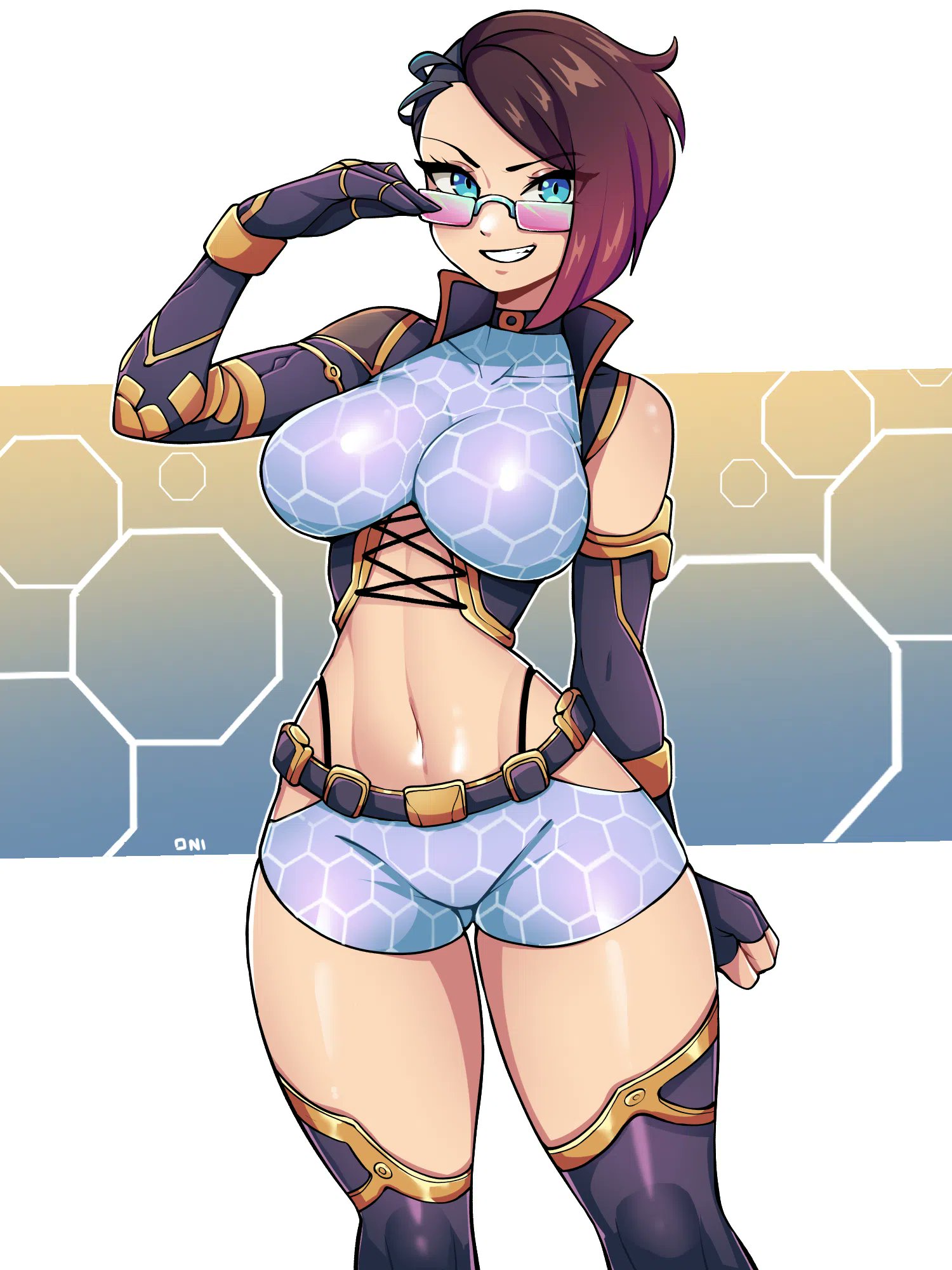 1girladjusting eyewearasymmetrical hairblue eyesblue shirtblue shortsbreastsbrown haircowboy shotcrop topcropped jacketcurvyglassesgrinhand upjacketlarge breastslooking at viewernavelopen clothesopen jacketpanty strapspink-tinted eyewearpurple jacketpurple thighhighsshirtshort hairshort shortsshortssingle bare shouldersmilesolostomachthick thighsthighhighsthighstinted eyewearwhite background