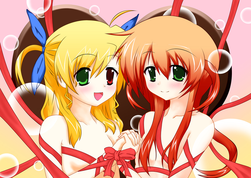 fate testarossa, takamachi nanoha, vita (nanoha), lyrical nanoha, mahou shoujo lyrical nanoha, mahou shoujo lyrical nanoha a's, 00s, 3girls, blonde hair, blue eyes, braid, brown eyes, long hair, multiple girls, orange shirt, shirt, twin braids, twintails