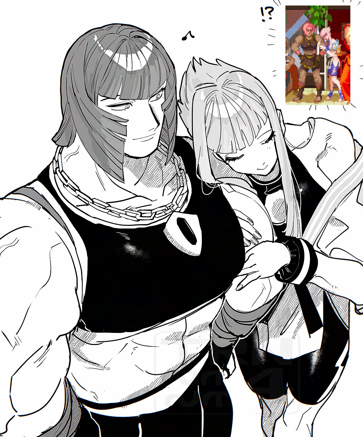 2girlsarm hugbicepschainchain necklacedougigreyscalejewelryleaning on personmonochromemultiple girlsmuscularmuscular femalenecklacereference insetshort hairshort hair with long lockssimple backgroundsmiletall femaleyuri