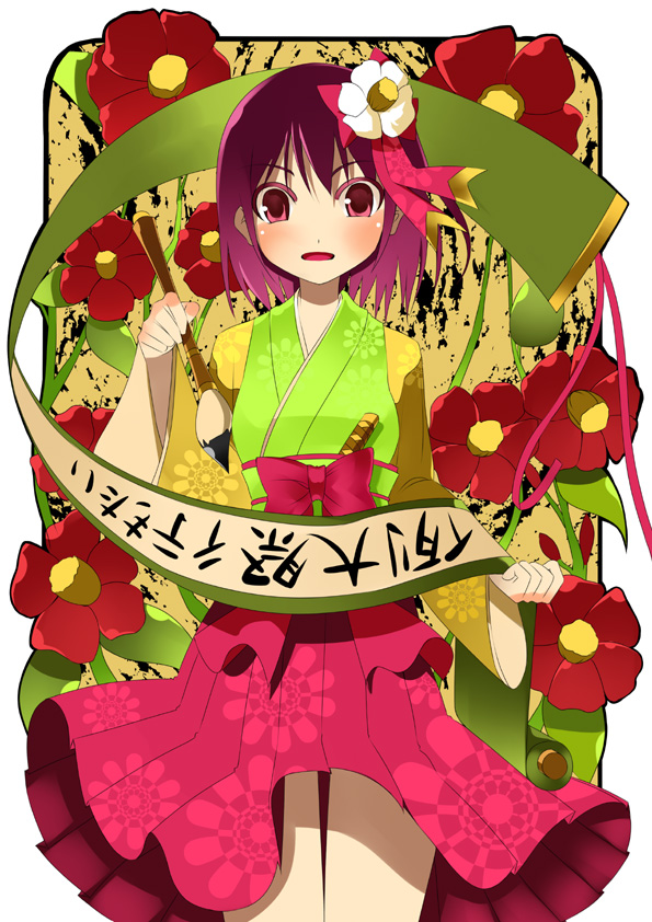 1girlcamelliacolored eyelasheseyelashesfemale focusflowerjapanese clotheskimonopurple eyespurple hairshort hairsolo